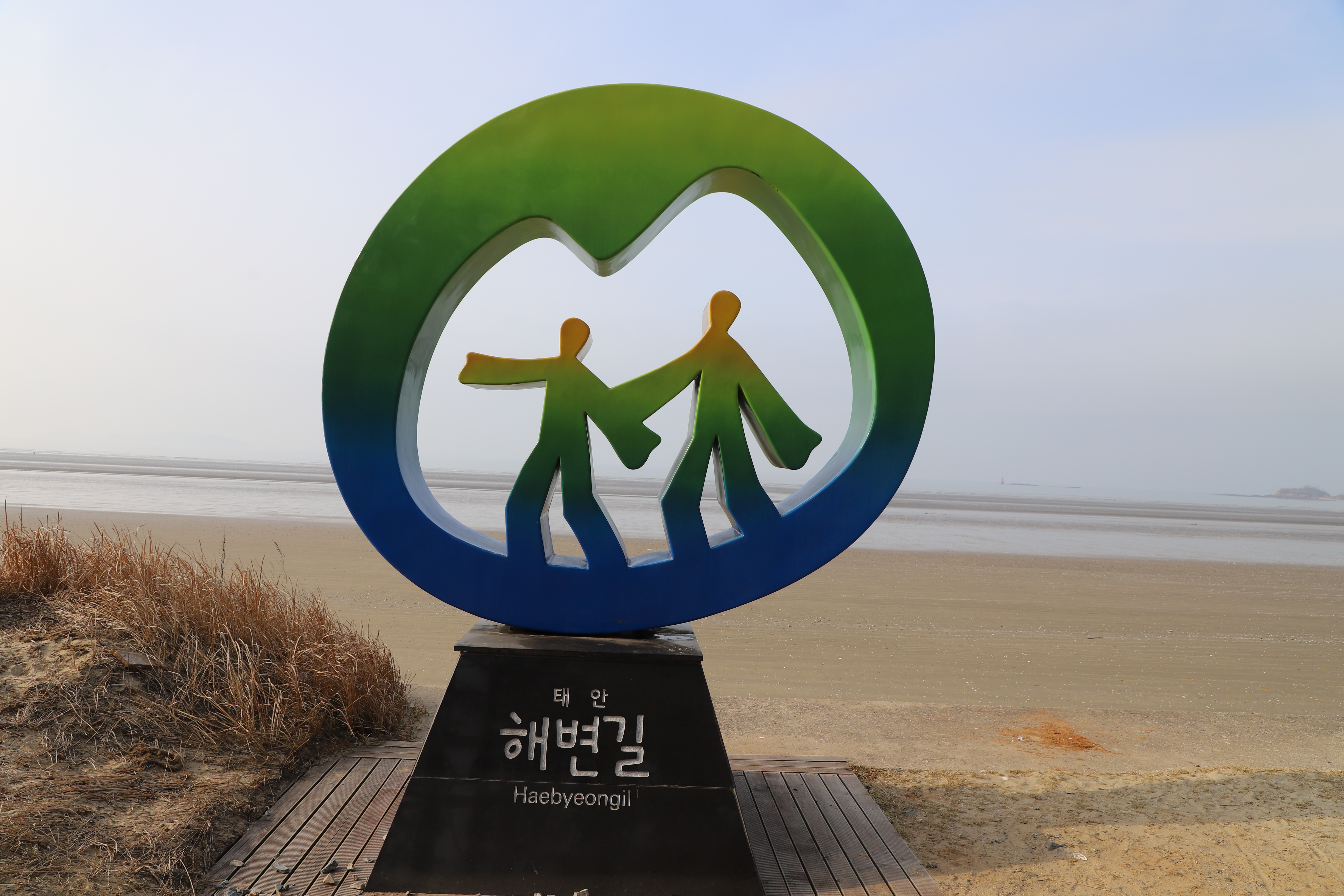 오른쪽에 태안해변길 조형물이 있고, 그 앞쪽에 몽산포 전망대가 있다.