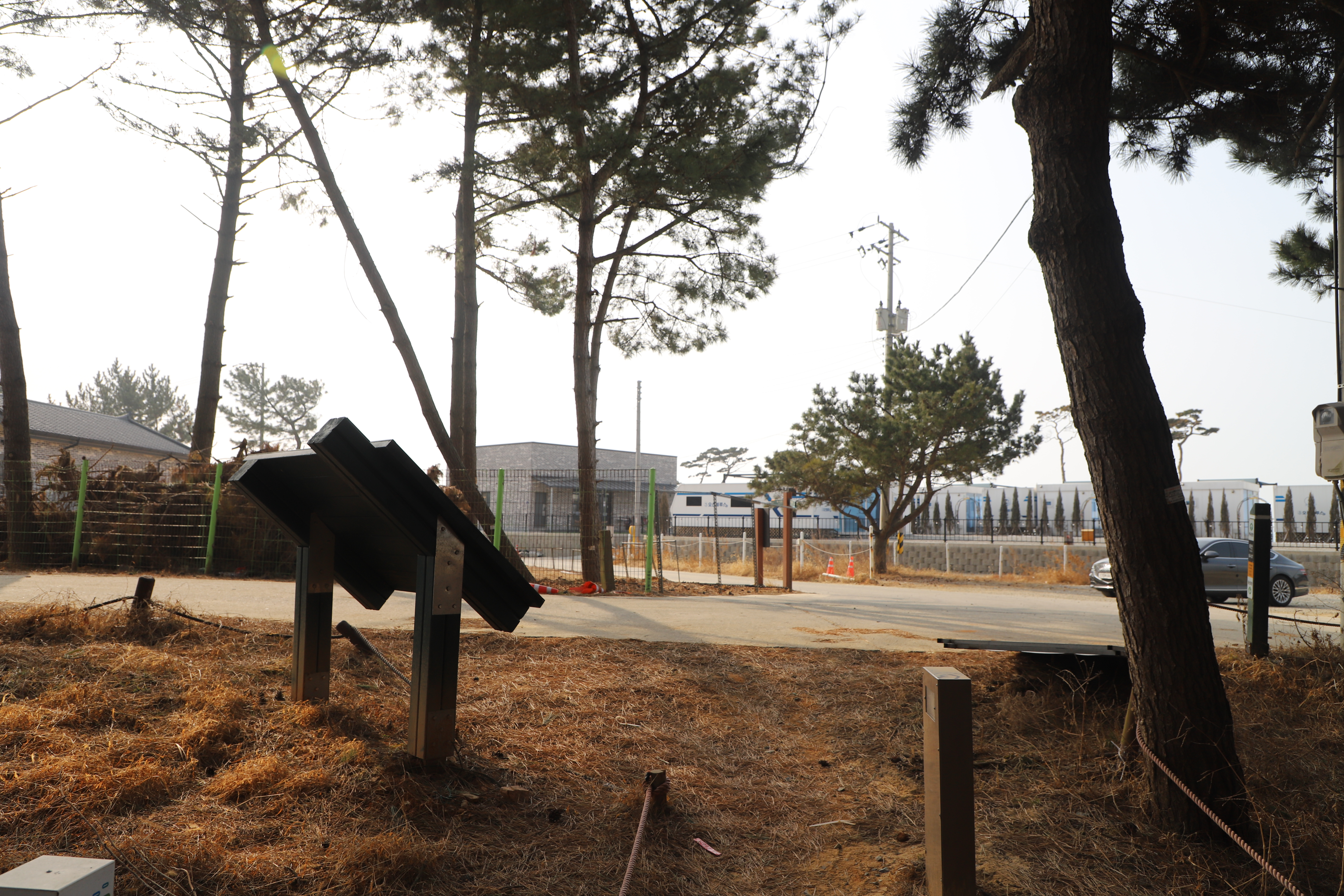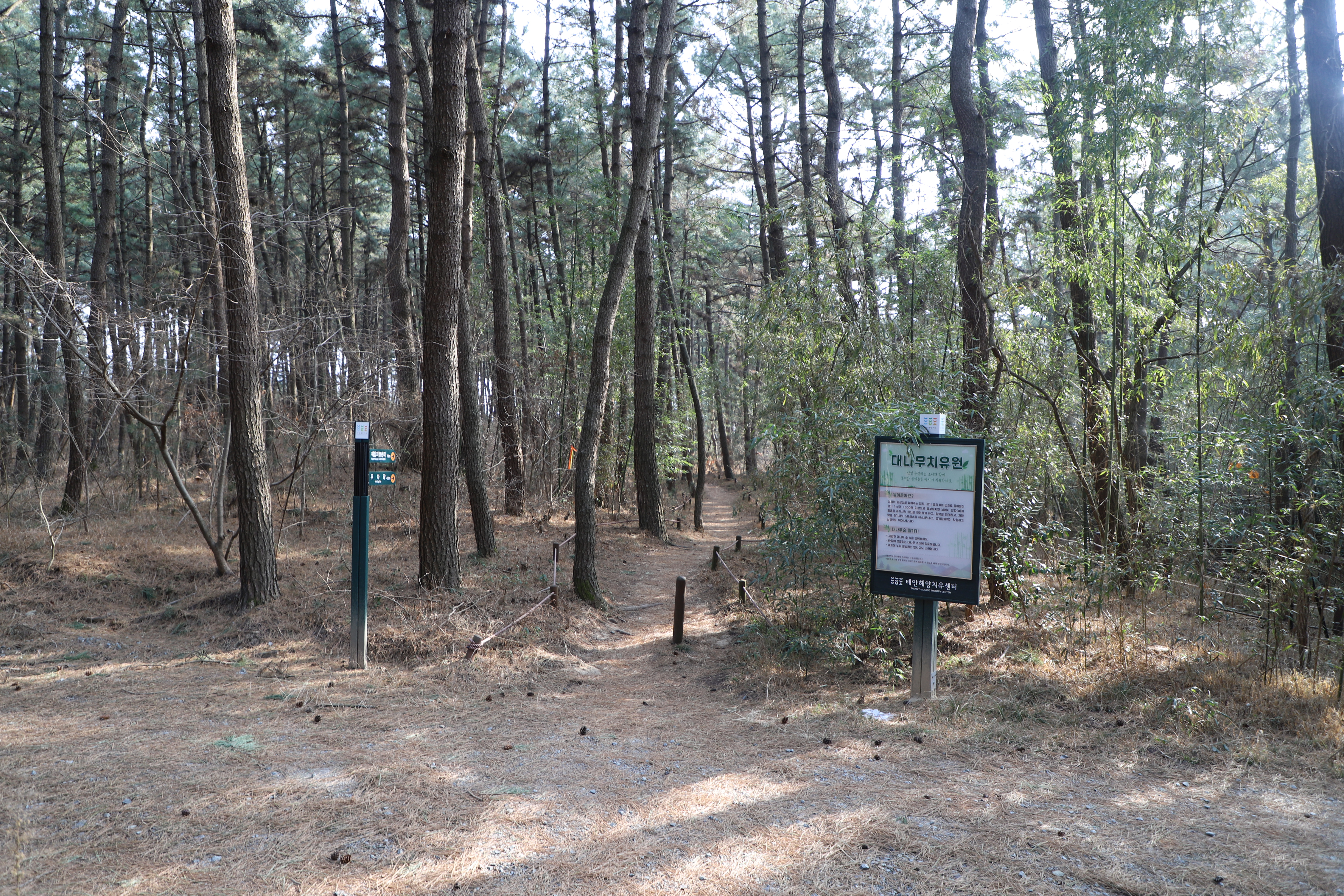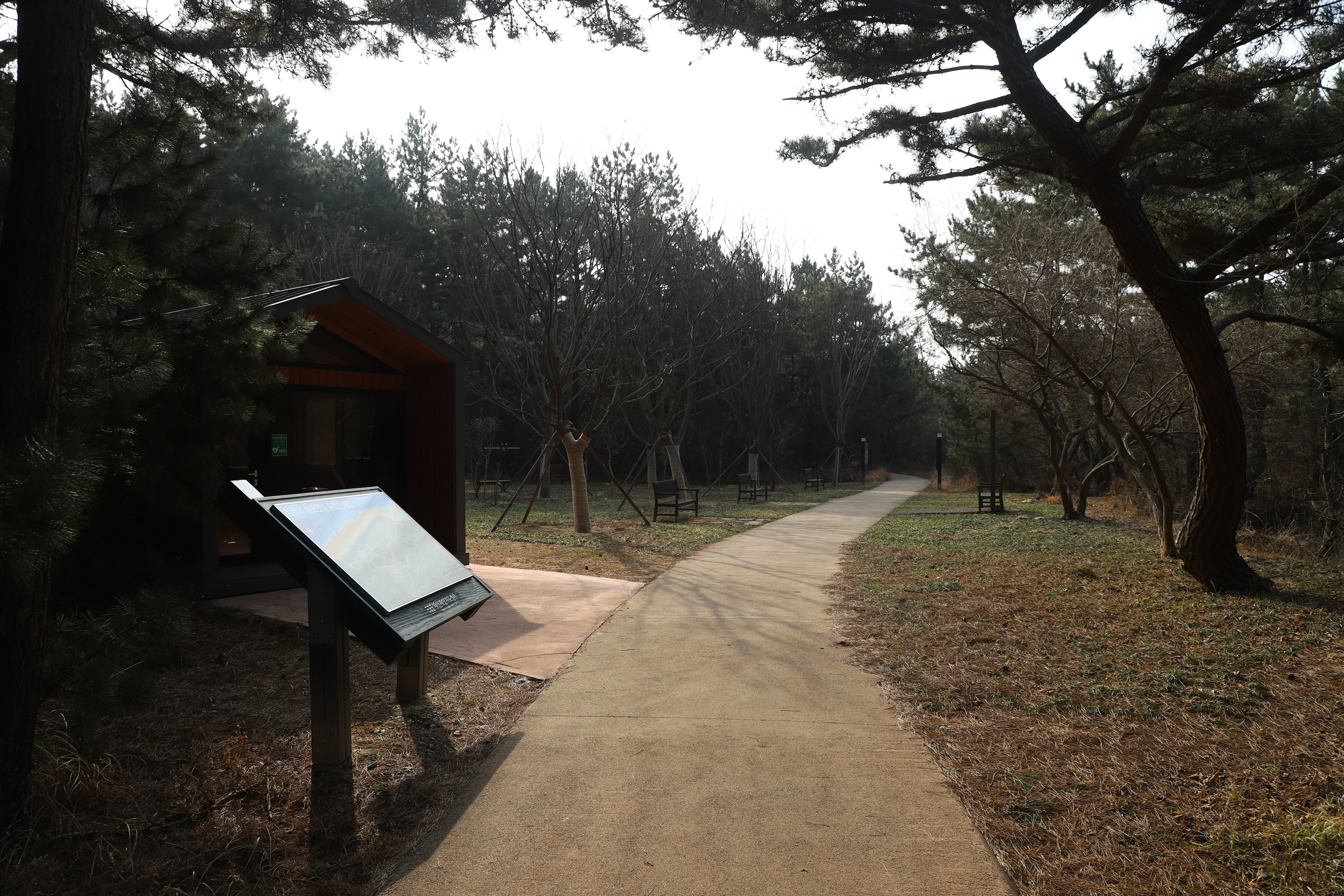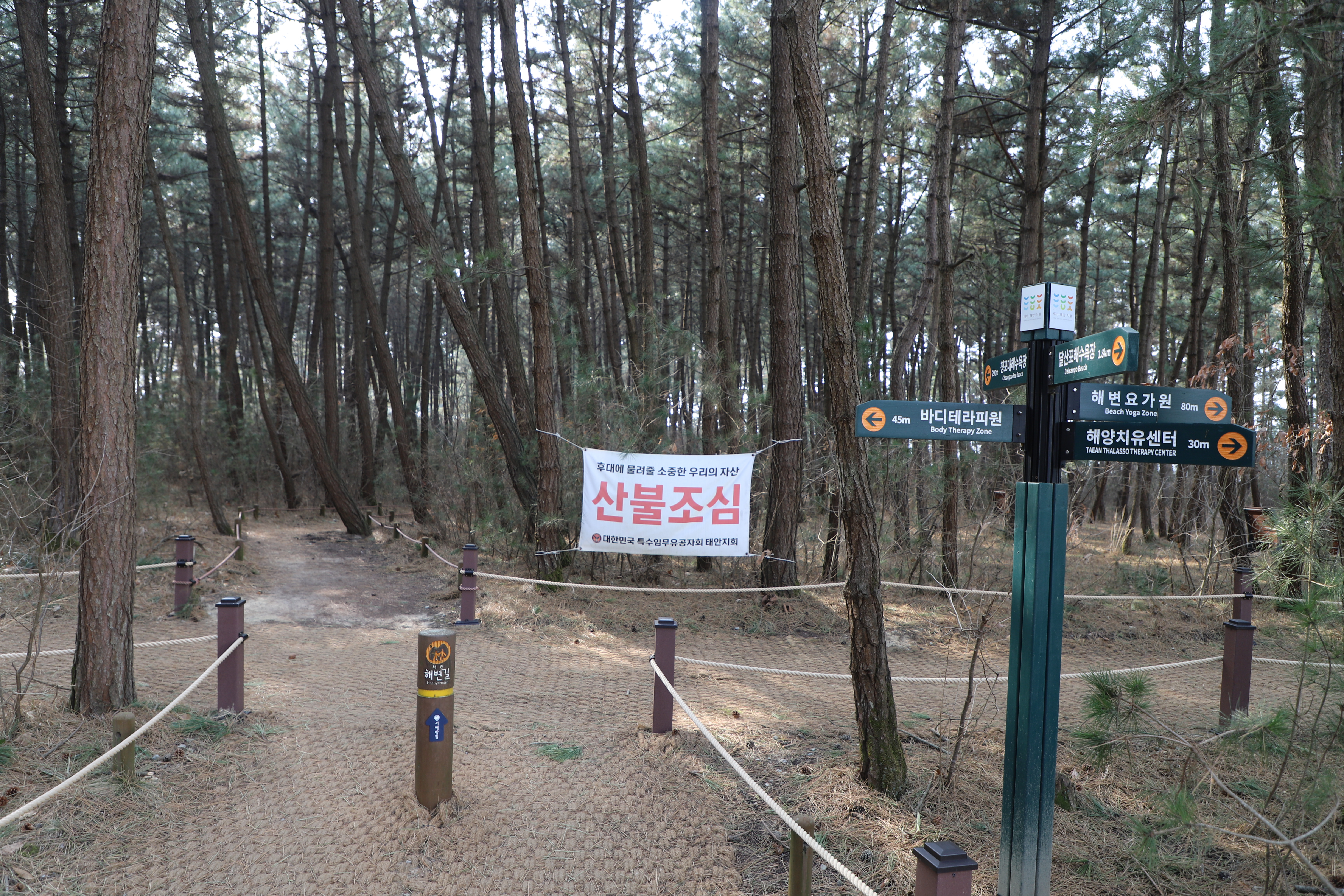 달산포 제방과 달산포 수문을 지나면 다시 해송숲이다. 달산포 수문 아래쪽이 달산포이며 달산포 해변은 그 남쪽 태안해양치유센터까지 이어진다. 해송숲에서 달산포 해변으로 나가 보아야 하지만 몇 년 전 청포대 해변에서 양잠리 해변, 달산포, 몽산포 해변까지 해변을 걷고 달산포 기수역을 건넌 추억으로 그 풍경을 상상한다. 달산리 해송숲은 치유의 숲이다. 전국에서 완도해양치유센터에 이어 두 번째로 문을 연 태안해양치유센터가 달산리 해변에 자리하며, 주변 숲을 치유의 숲길로 조성하여 힐링쉼터 등 여러 치유의 장소가 조성되었다. 지난 번에 이곳에 왔을 때는 해양치유센터가 공사 중이었는데 이번에 와서 보니 지난 해 11월에 완공되어 준공식을 거행하고 시범운영 중이라고 한다. 숲길에 치유 장소와 안내판, 시설 등이 잘 조성되어 길손은 편안하게 숲길을 걷는 즐거움에 빠졌다.