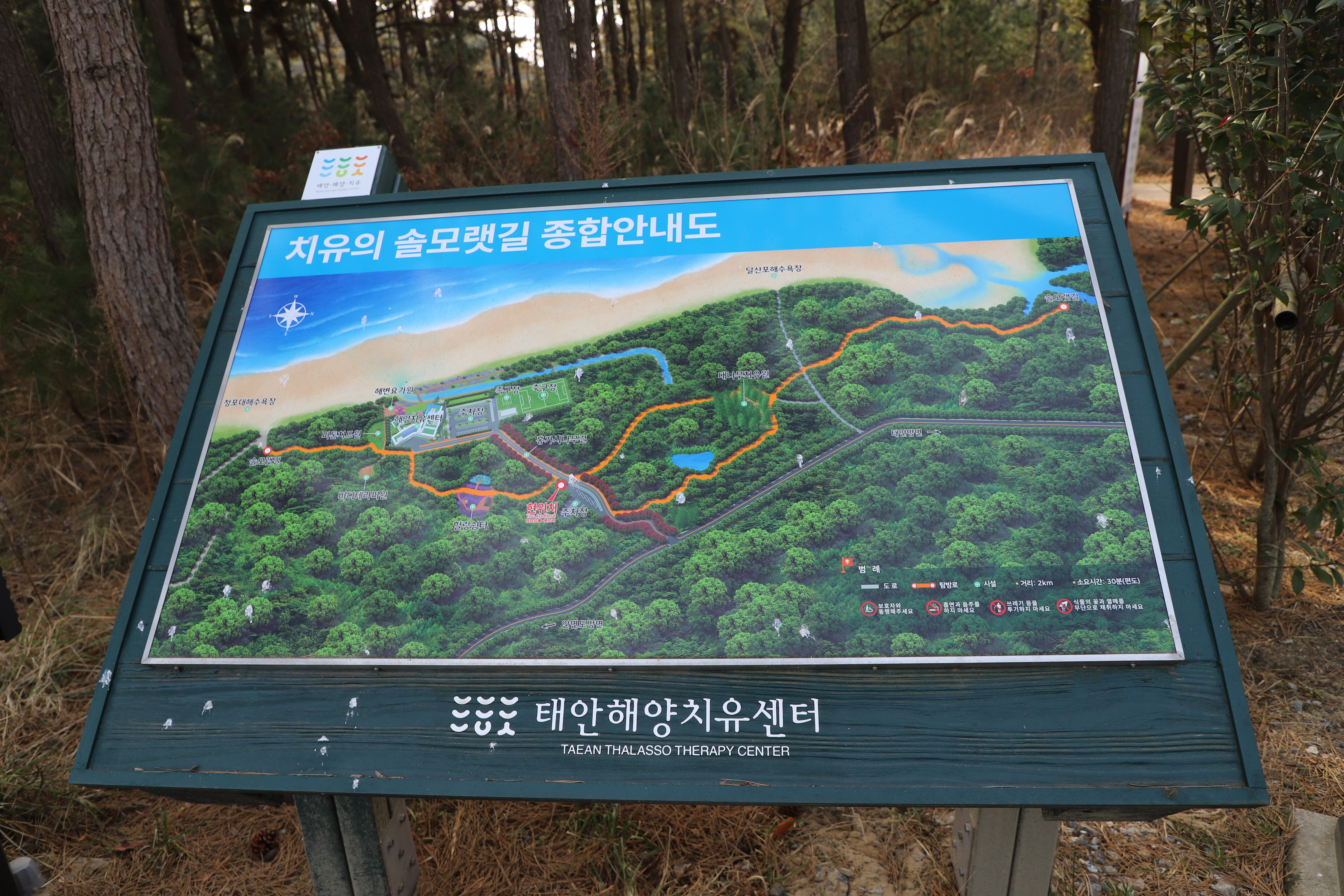 태안 해안치유센터는 달산포로를 따라 곧바로 가고, 동서트레일은 종합안내도 오른쪽 숲길로 이어간다.