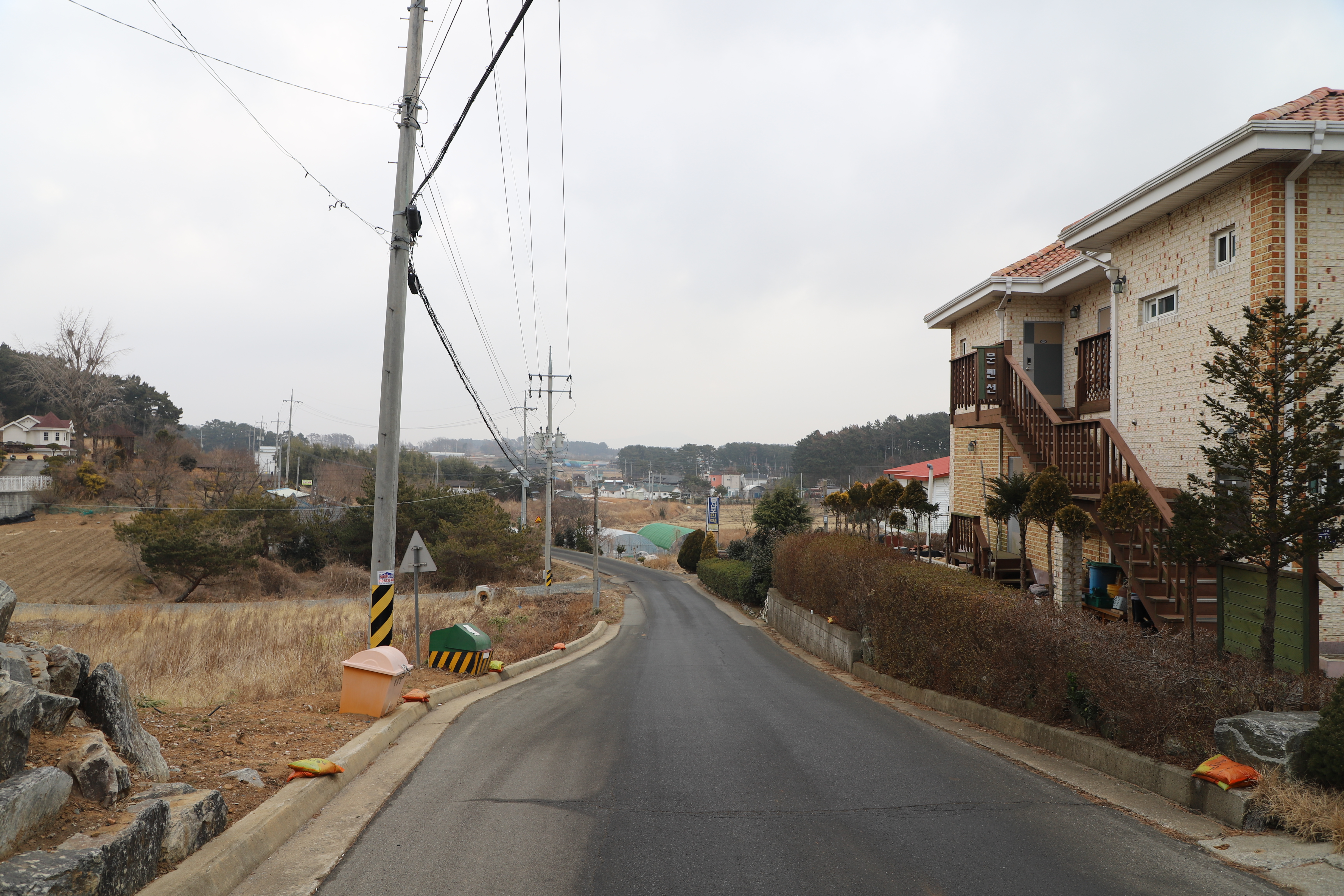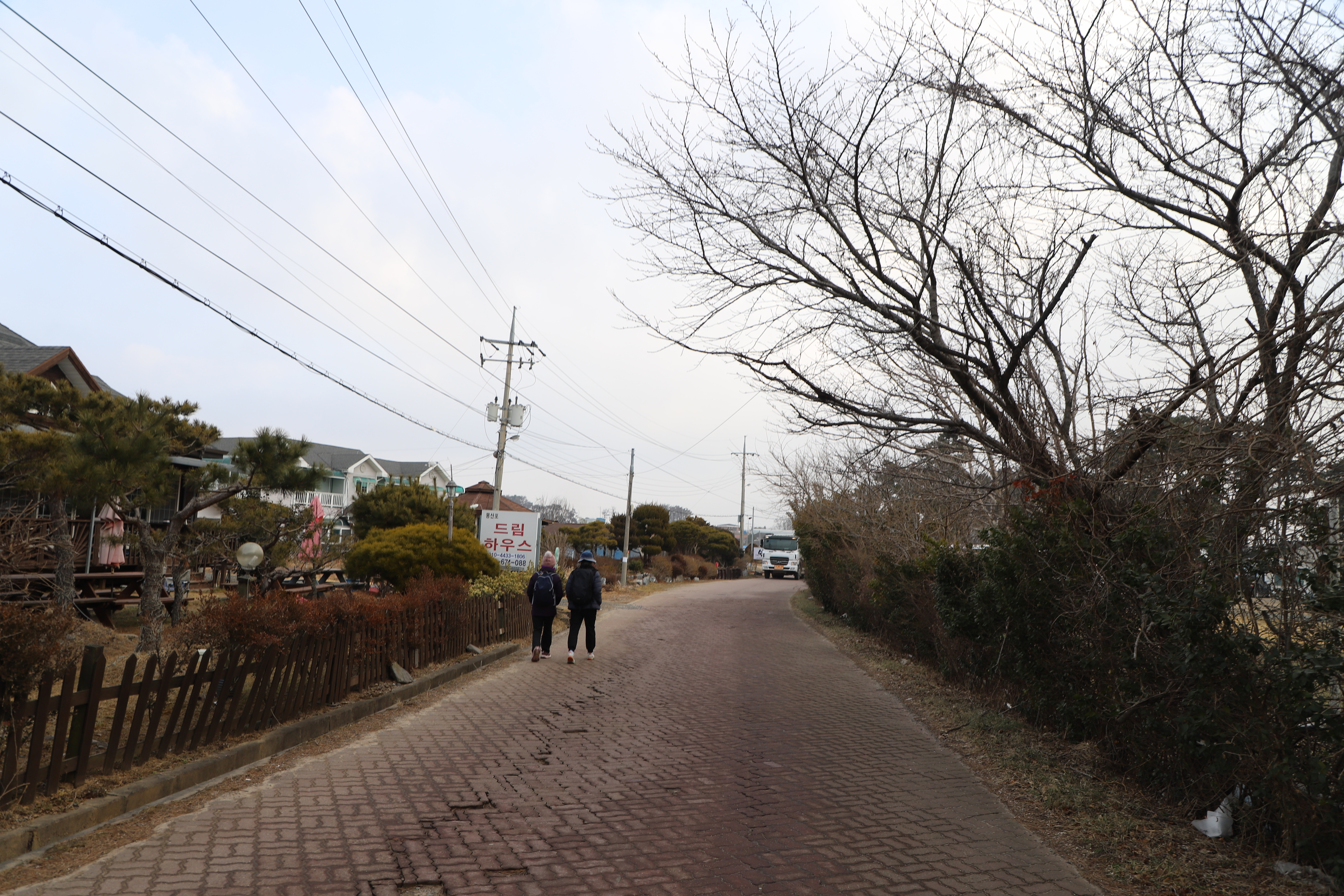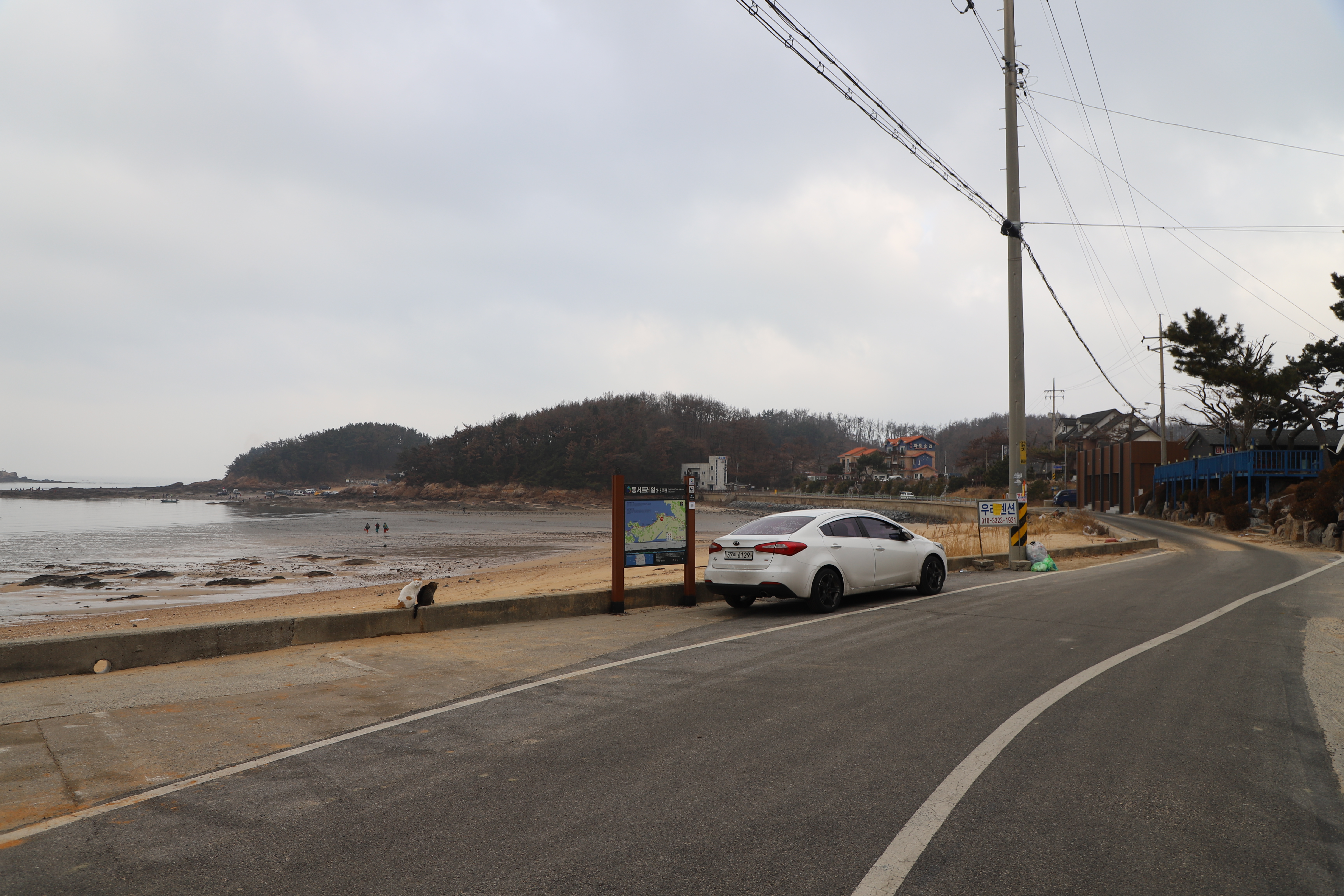 해안에 여러 펜션들이 자리하고 안쪽에 자리한 슈슈 풀빌라 펜션을 지나면 앞에 갈림길이 나온다.