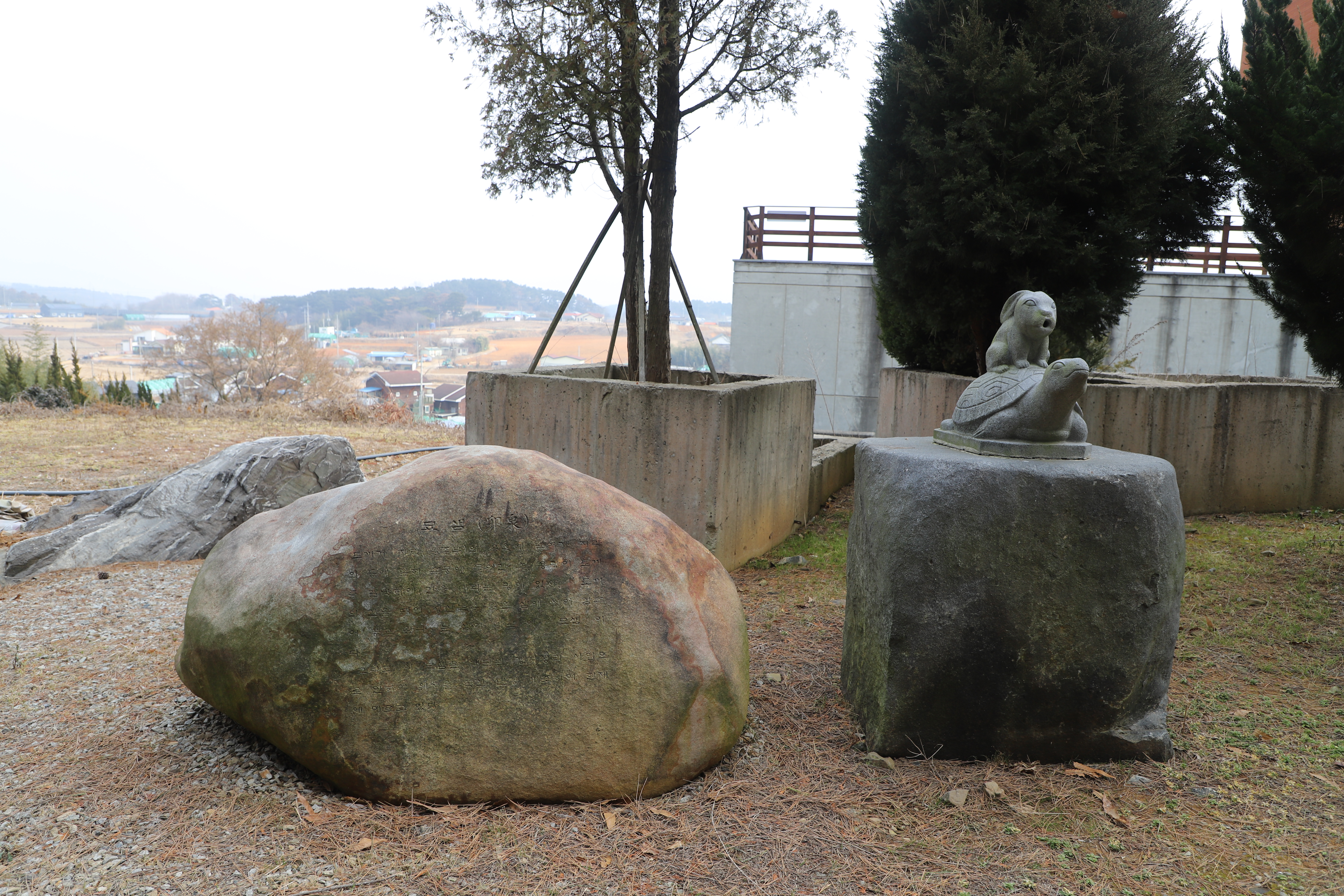 노루미재 숲을 넘어서 별주부마을 문화센터 뒤쪽으로 올라왔다. 언덕 뜰에 묘샘 그리고 자루와 토끼 조형물이 조성되어 있다.