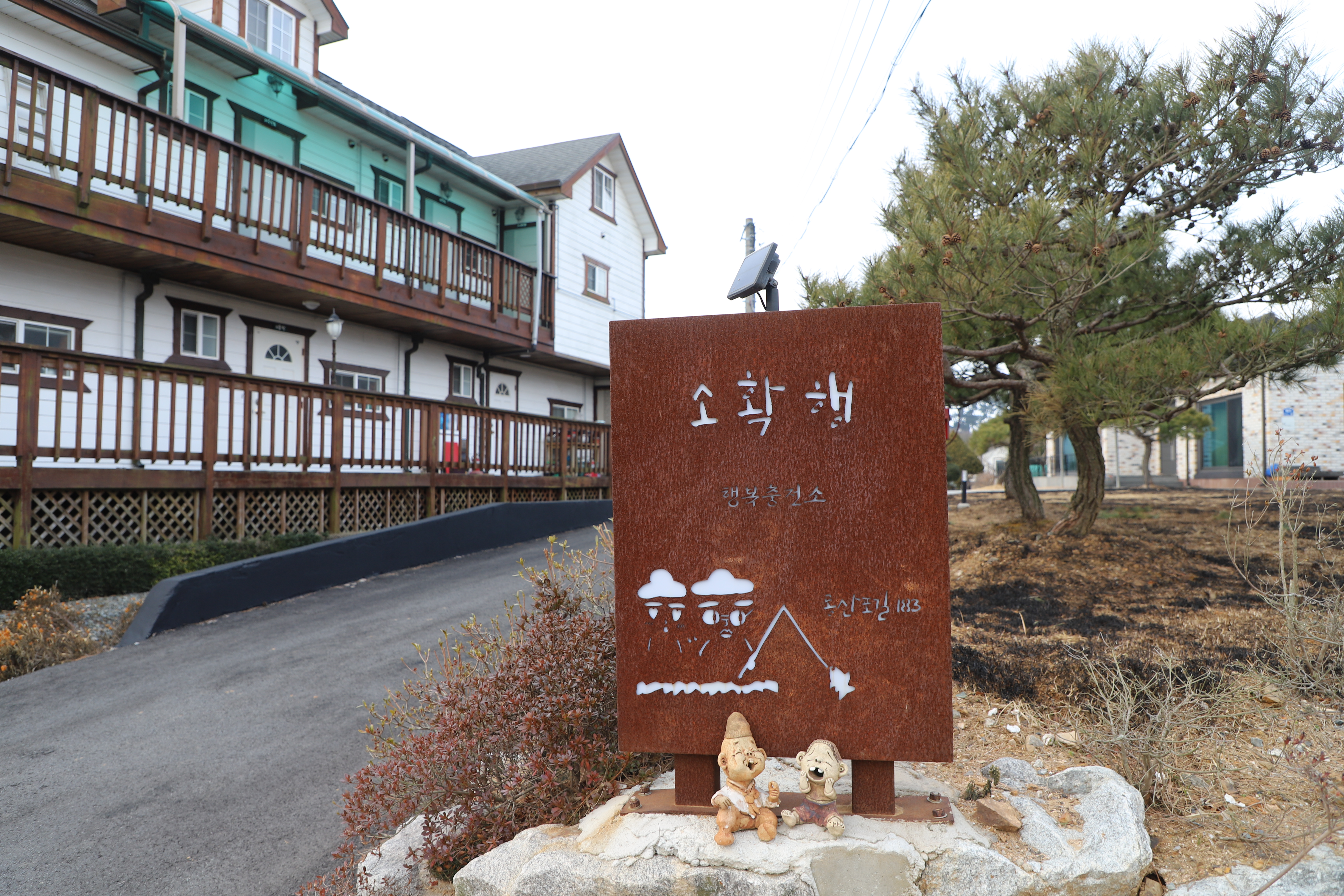 데이지펜션 옆 출입구 몽산포길 183에 행복충전소 소확행 조형물이 설치되어 있다.