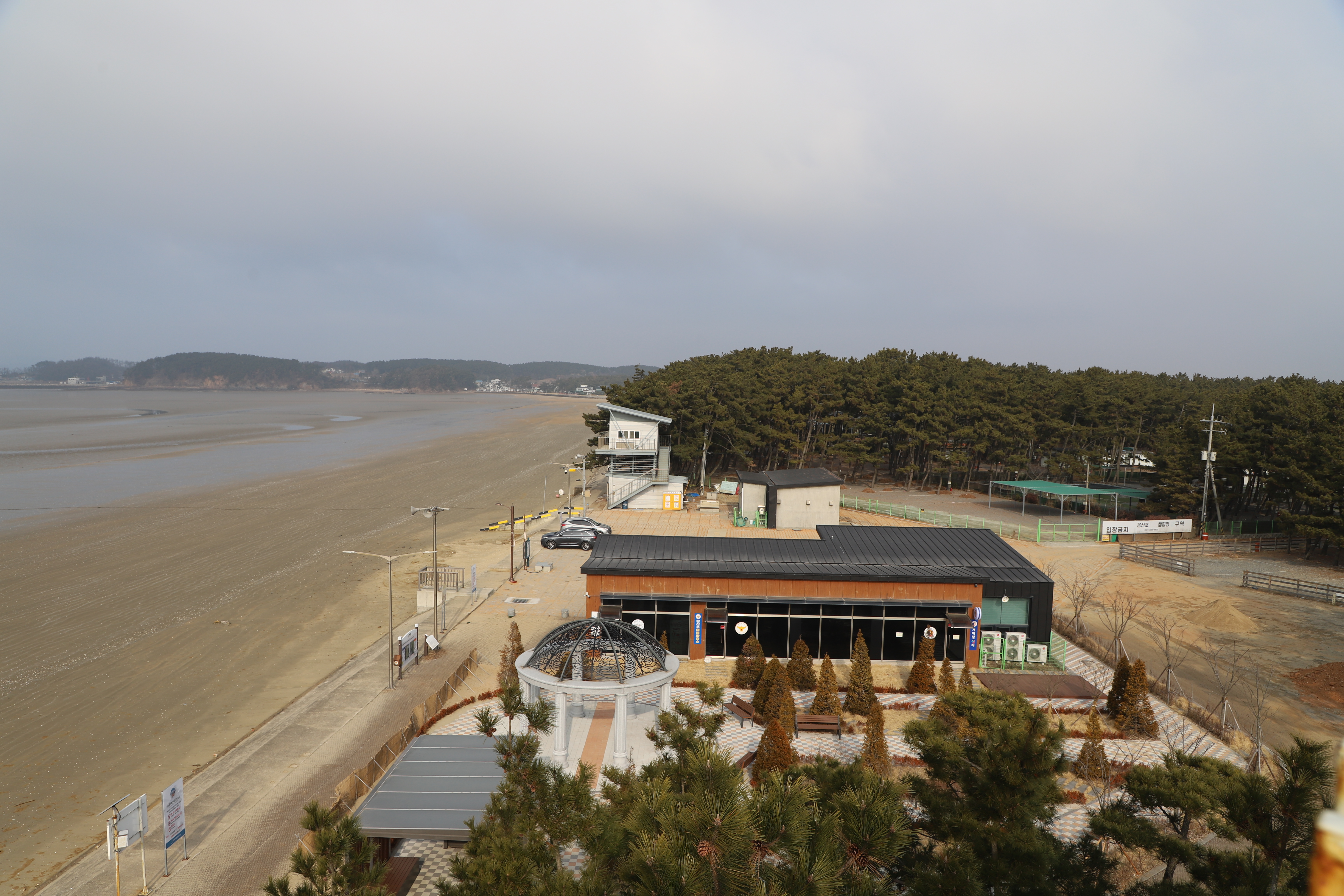 오른쪽 건너편에 태안해안체험학습관, 왼쪽 몽산포 주차장 위에 몽산포탐방지원센터 남면분소가 있다.