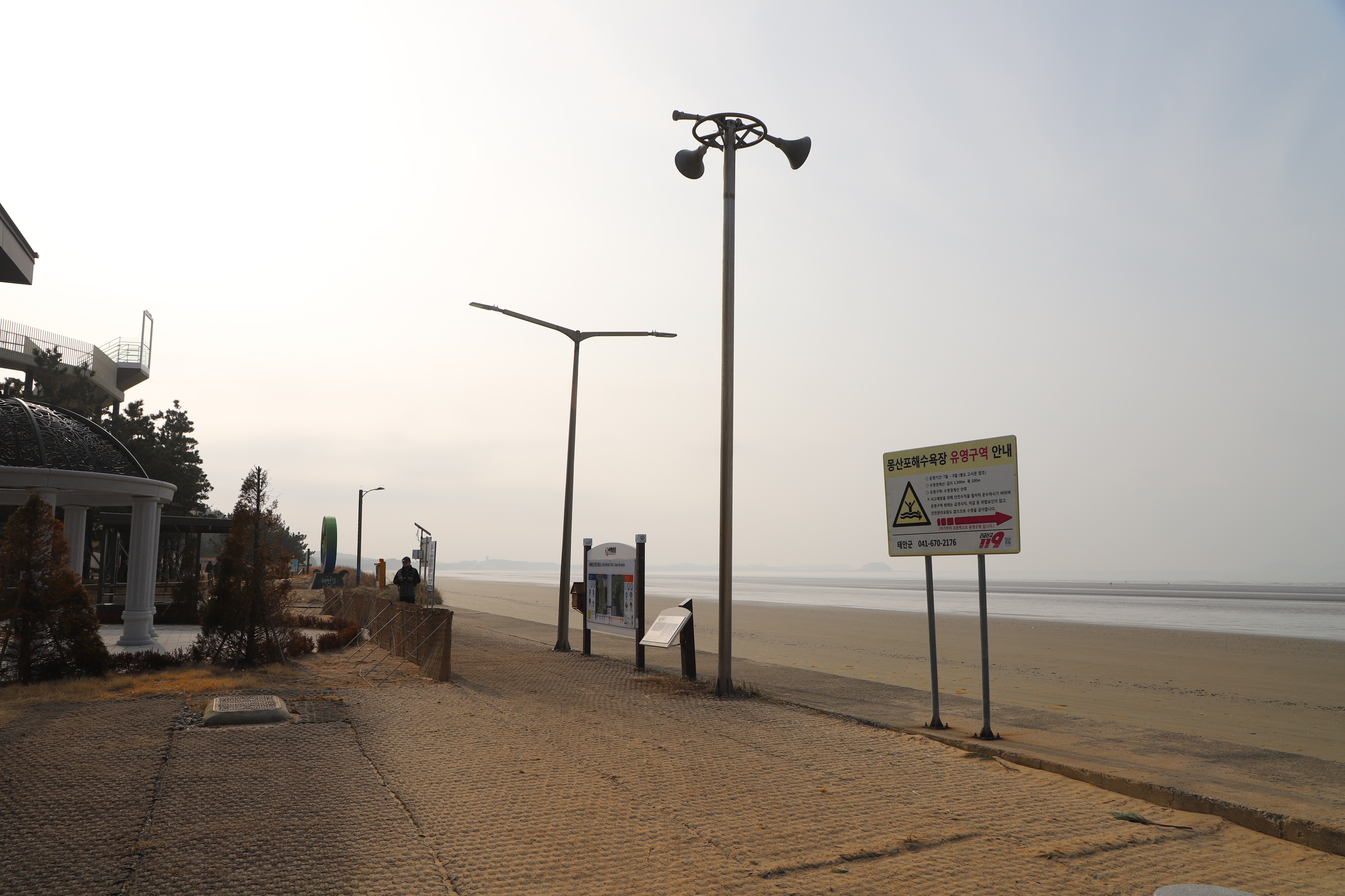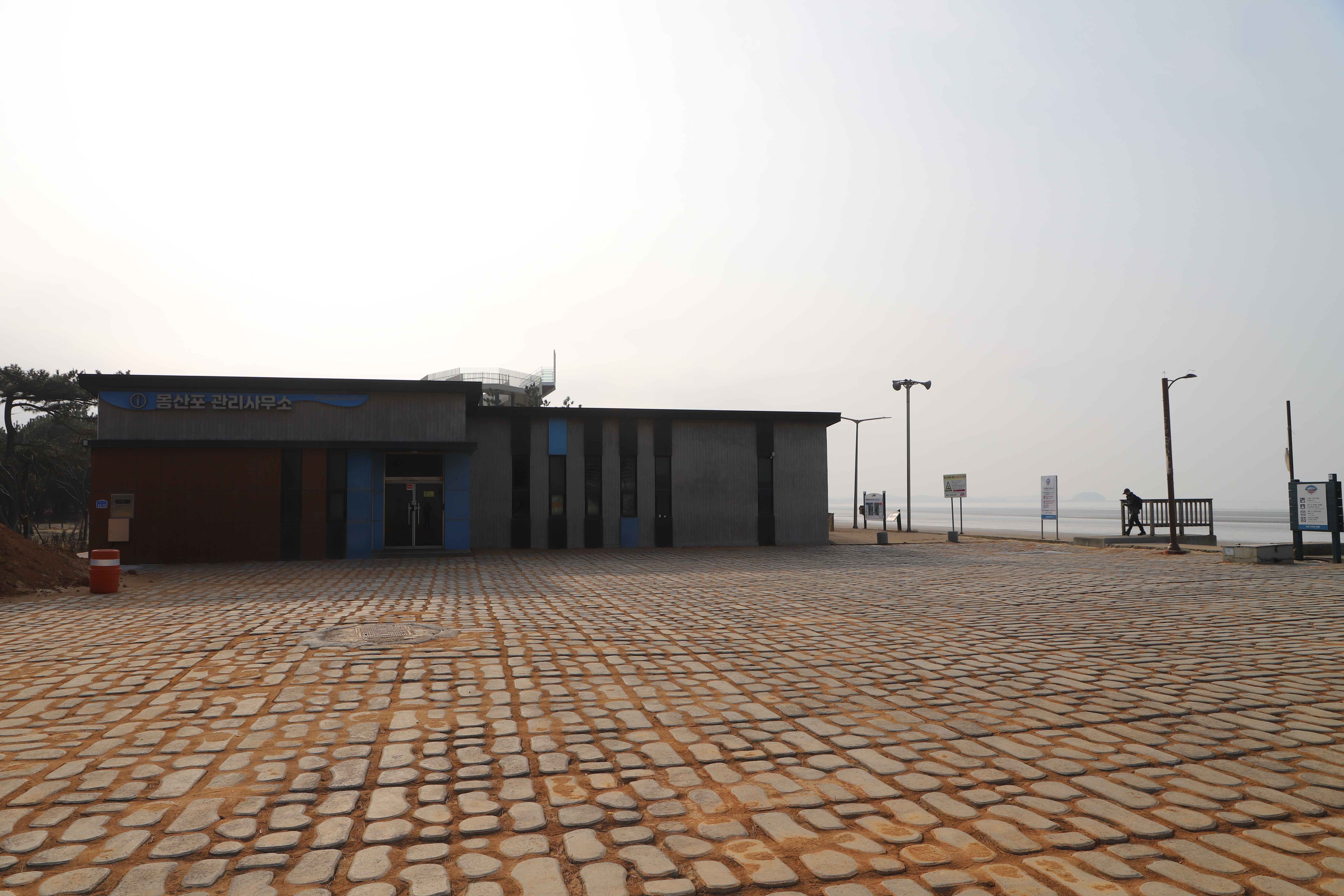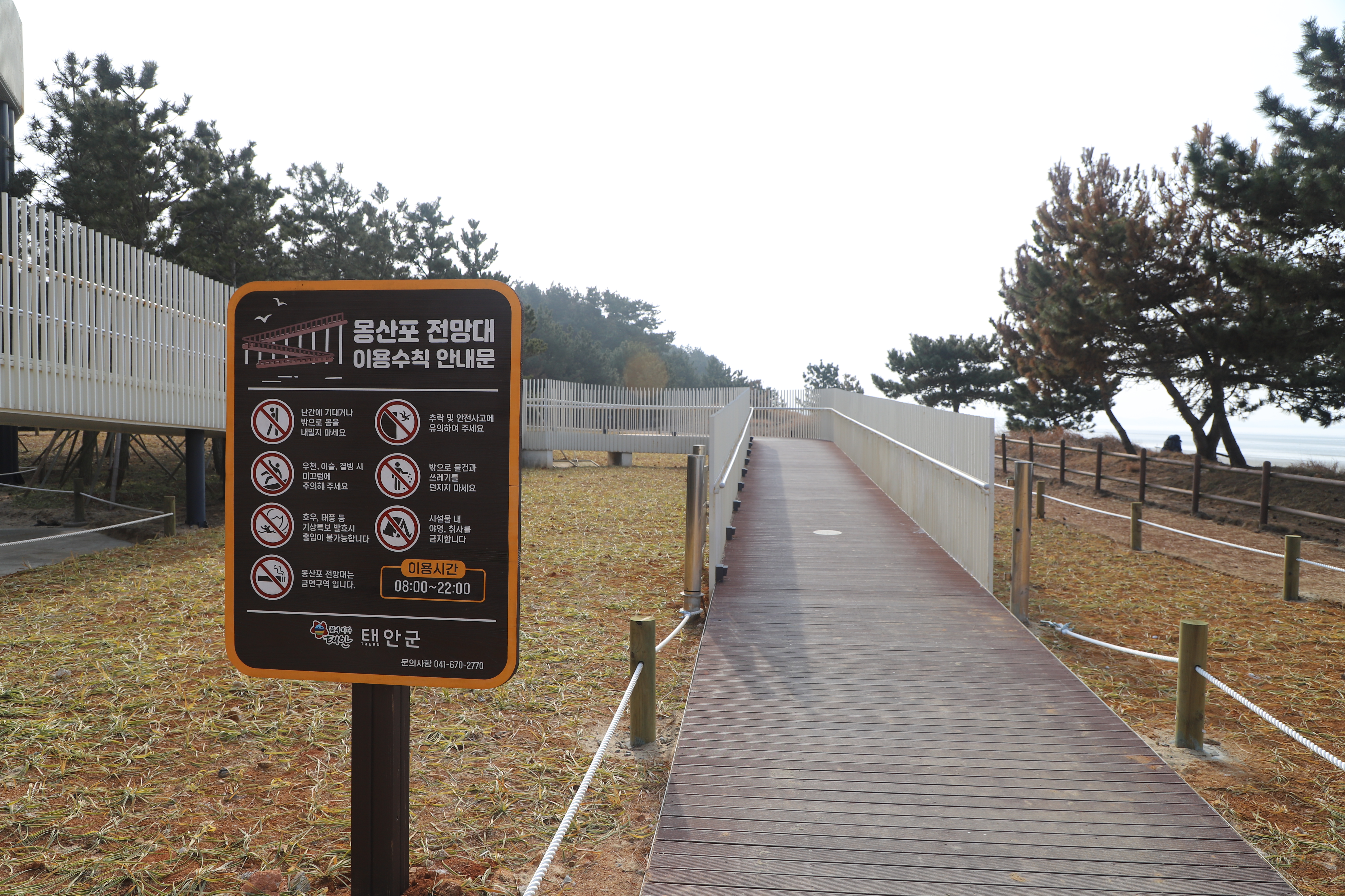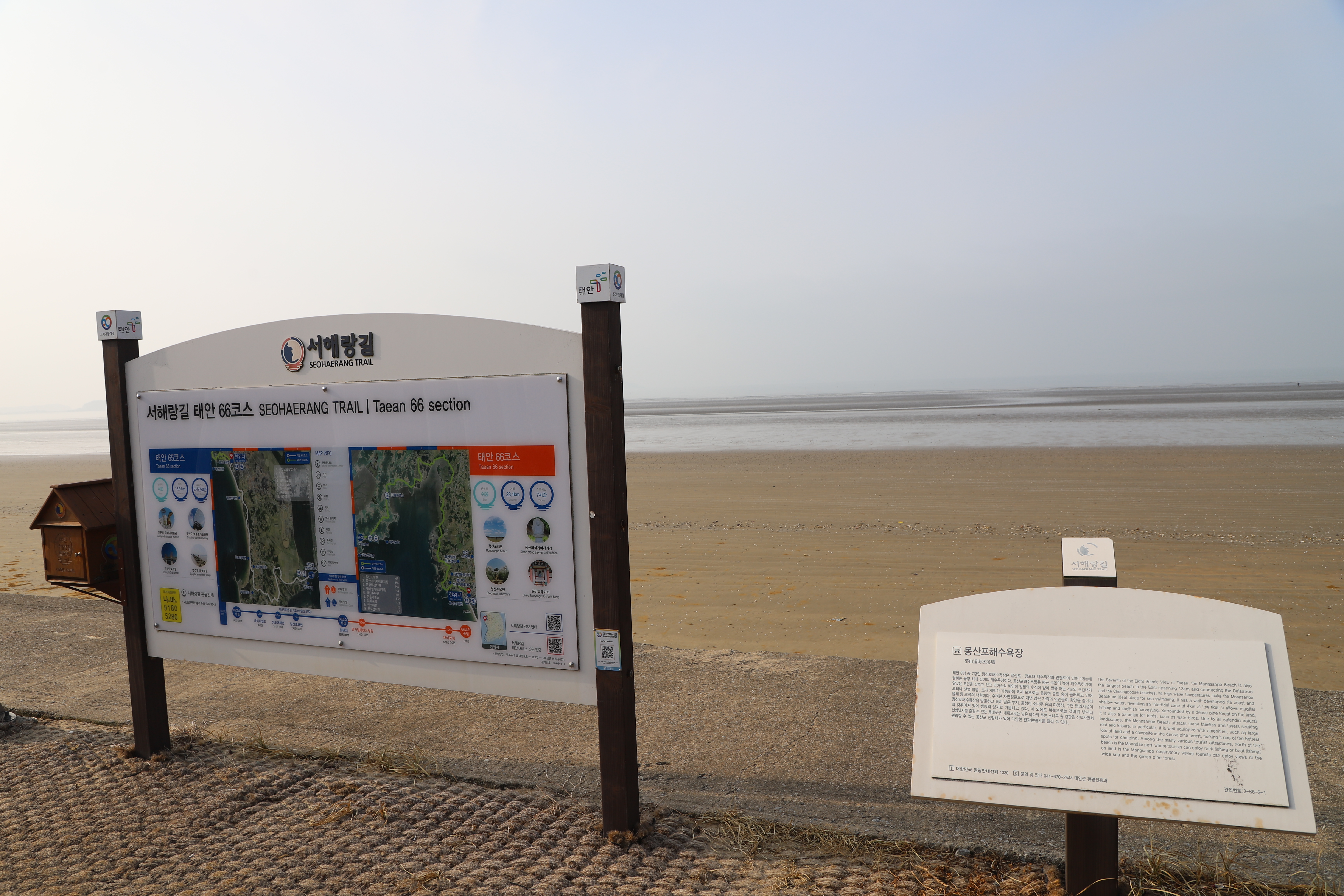몽산포 해수욕장 안쪽에 몽산포 관리사무소가 자리하고, 오른쪽 해변길에 서해랑길 안내판이 설치되어 있다.