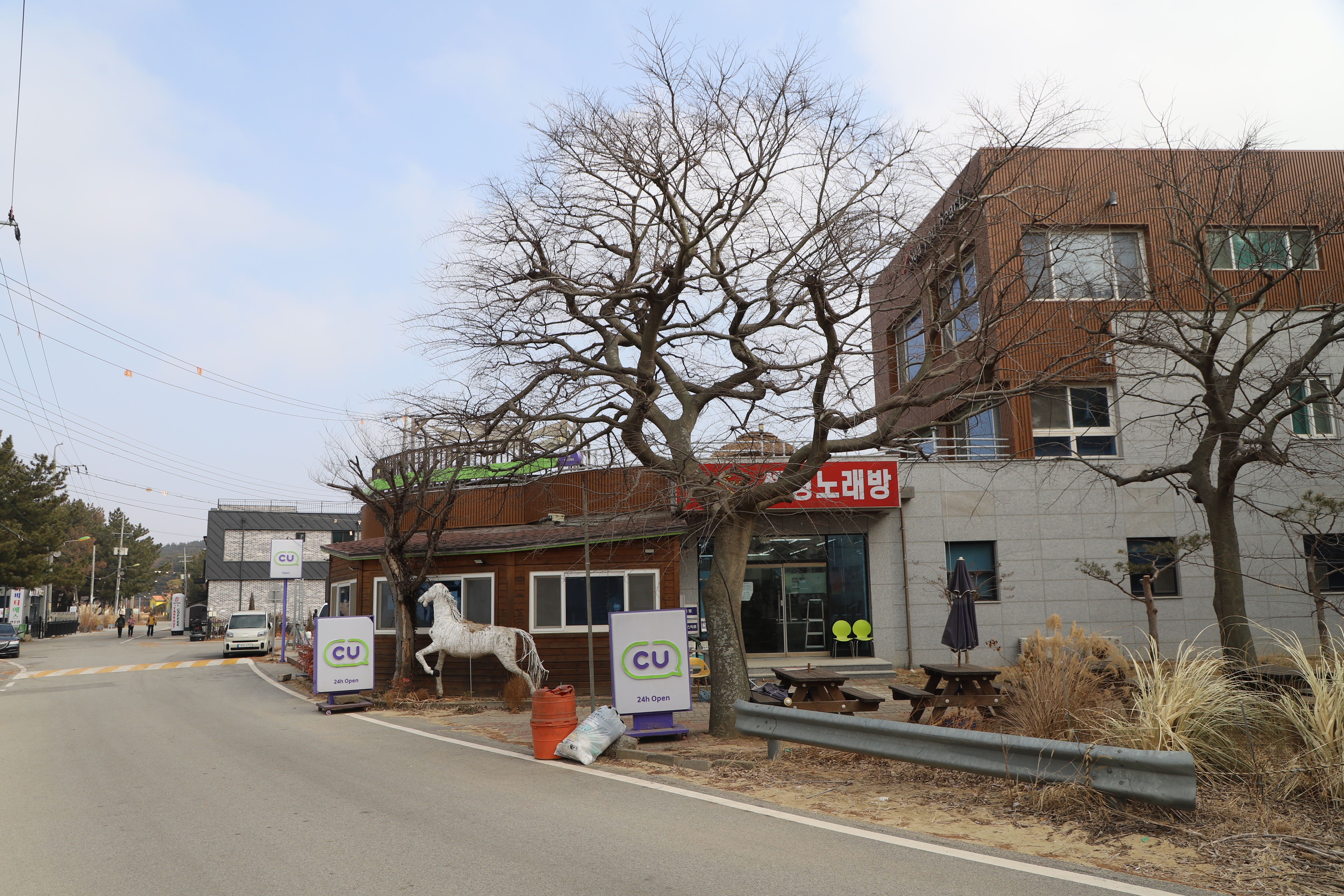 공중화장실을 지나와 돌아보니 CU편의점과 셀링노래방 옆에 백마 조형물이 뛰어가는 것 같다.