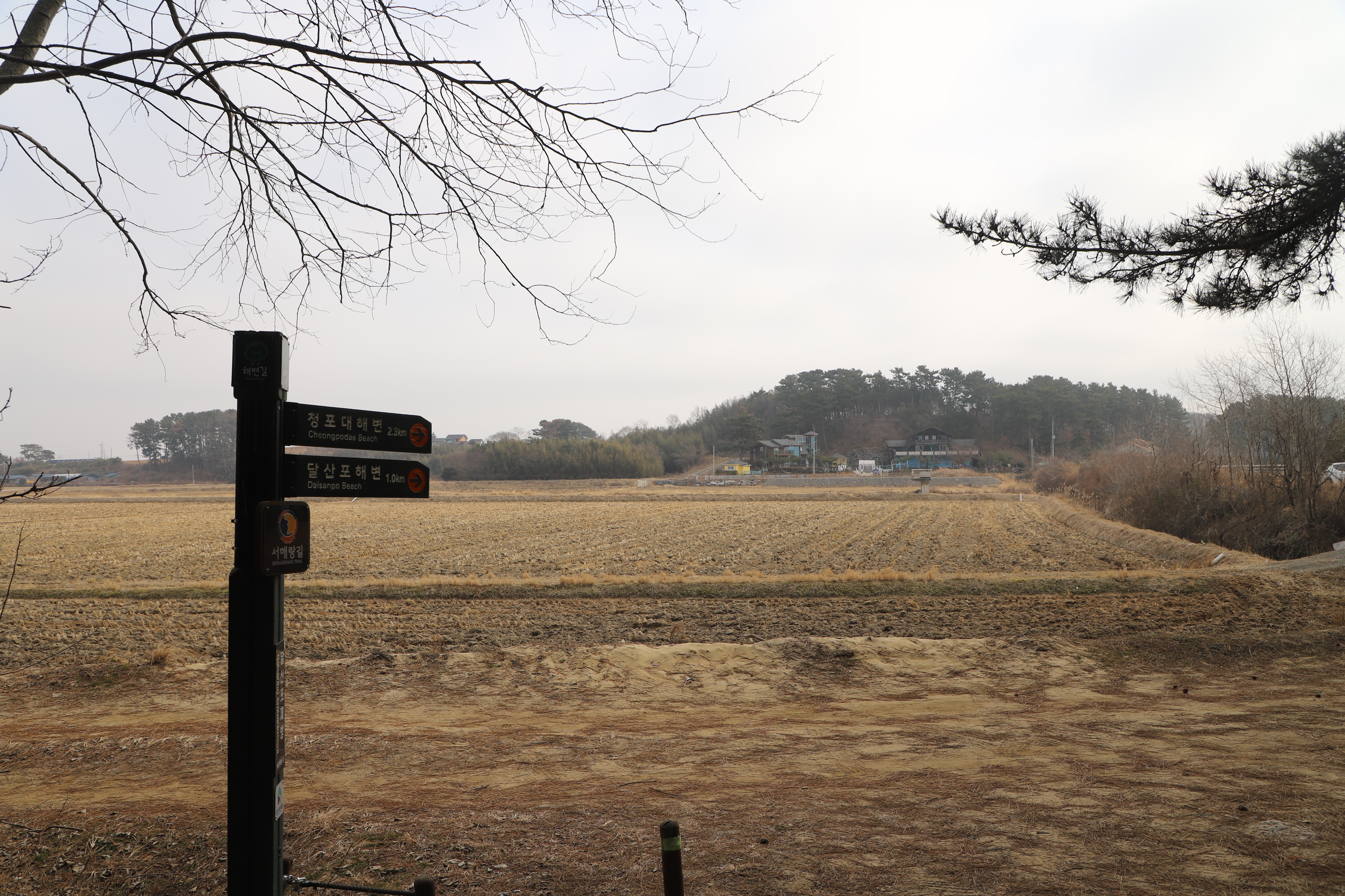 달산포 해변의 해송림 숲길을 걸어 달산포 제방을 건넜다. 제방 위는 간척지인 고잿목(皐子項)들이다.