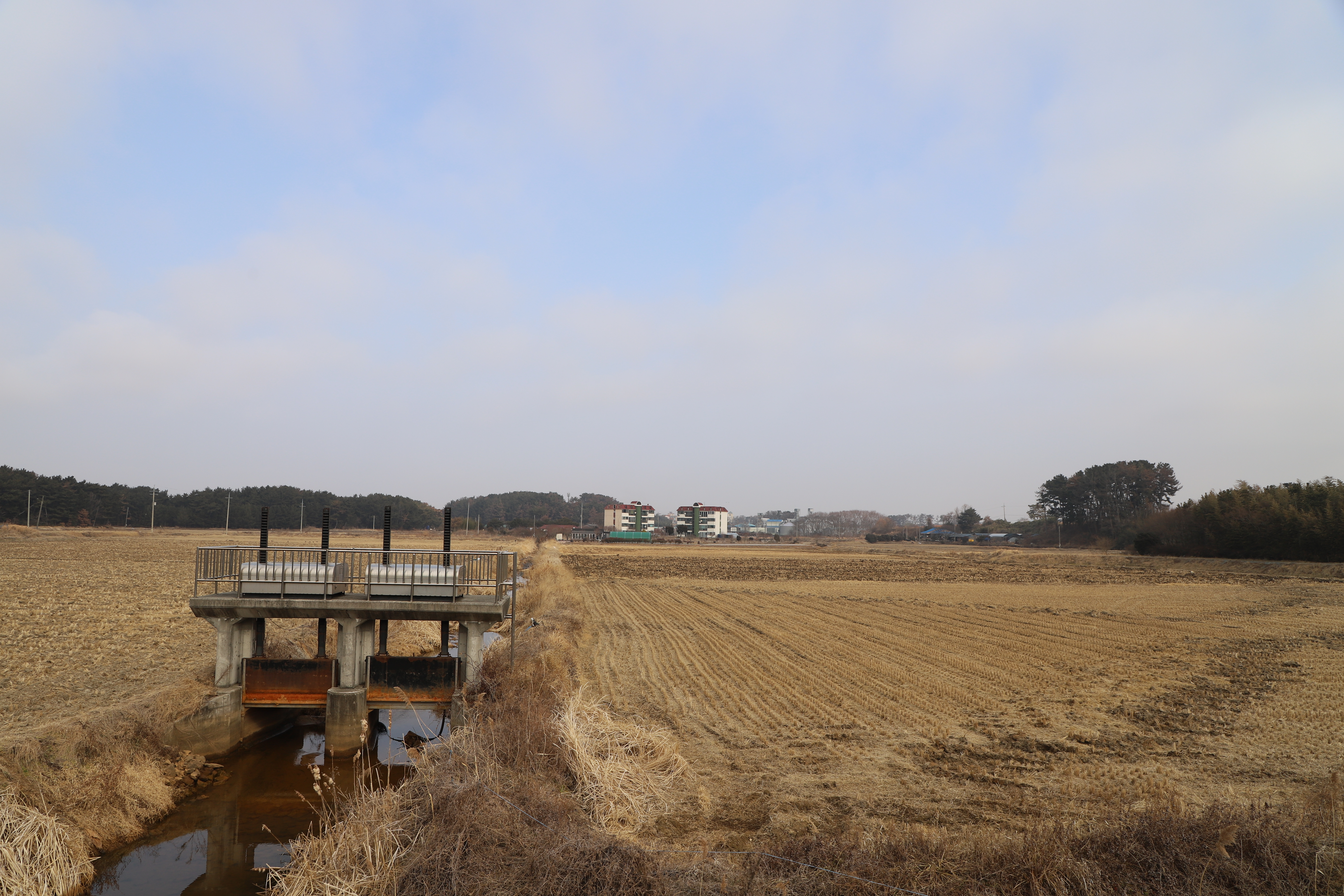 달산포 제방에서 고잿목들 간척지를 살펴보았다. 앞에는 수로의 수문이 있고, 뒤쪽에 태안군 남면 면소재지 달산리 중심지가 보인다.