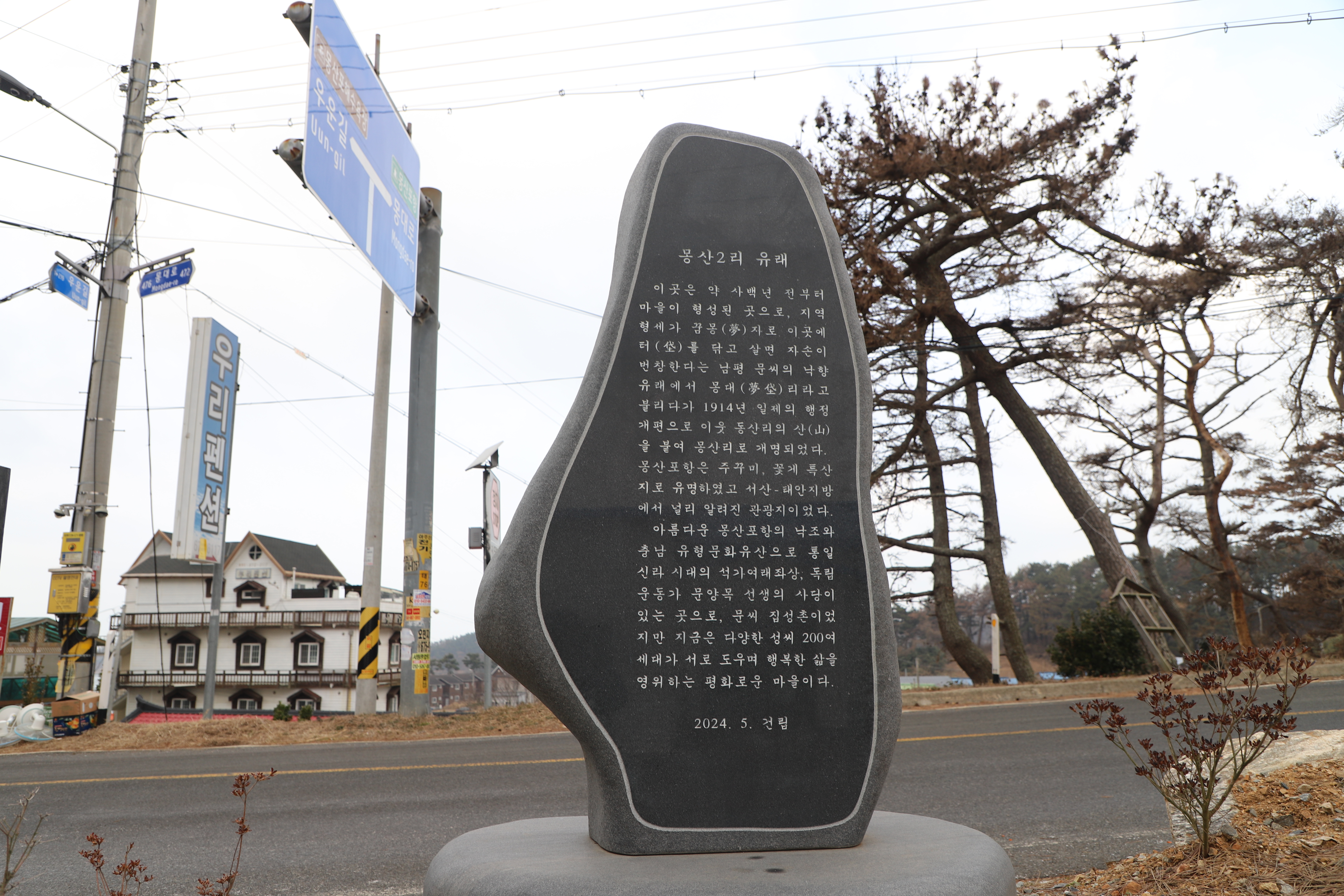 몽산2리 표석 뒷면에 몽산2리 유래가 적혀 있다. "몽산2리 유래 : 이곳은 약 사백년 전부터 마을이 형성된 곳으로, 지역형세가 꿈 몽(夢)지로 이곳에 터(垈)를 닦고 살면 자손이 번창한다는 남평 문씨의 낙향 유래에서 몽대리(夢垈里)라고 불리다가 1914년 일제의 행정 개편으로 이웃 동산리의 산(山)을 붙여 몽산리로 개명되었다. 몽산포항은 주꾸미, 꽃게 주산지로 유명하였고 서산-태안지방에서 널리 알려진 관광지였다. 아름다운 몽산포항의 낙조와 충남 유형문화유산으로 통일신라 시대의 석가여래좌상, 독립운동가 문양옥 선생의 사당이 있는 곳으로, 문씨 집성촌이었지만 지금은 다양한 성씨 200여 세대가 서로 도우며 행복한 삶을 영위하는 평화로운 마을이다." 2024.5. 건립