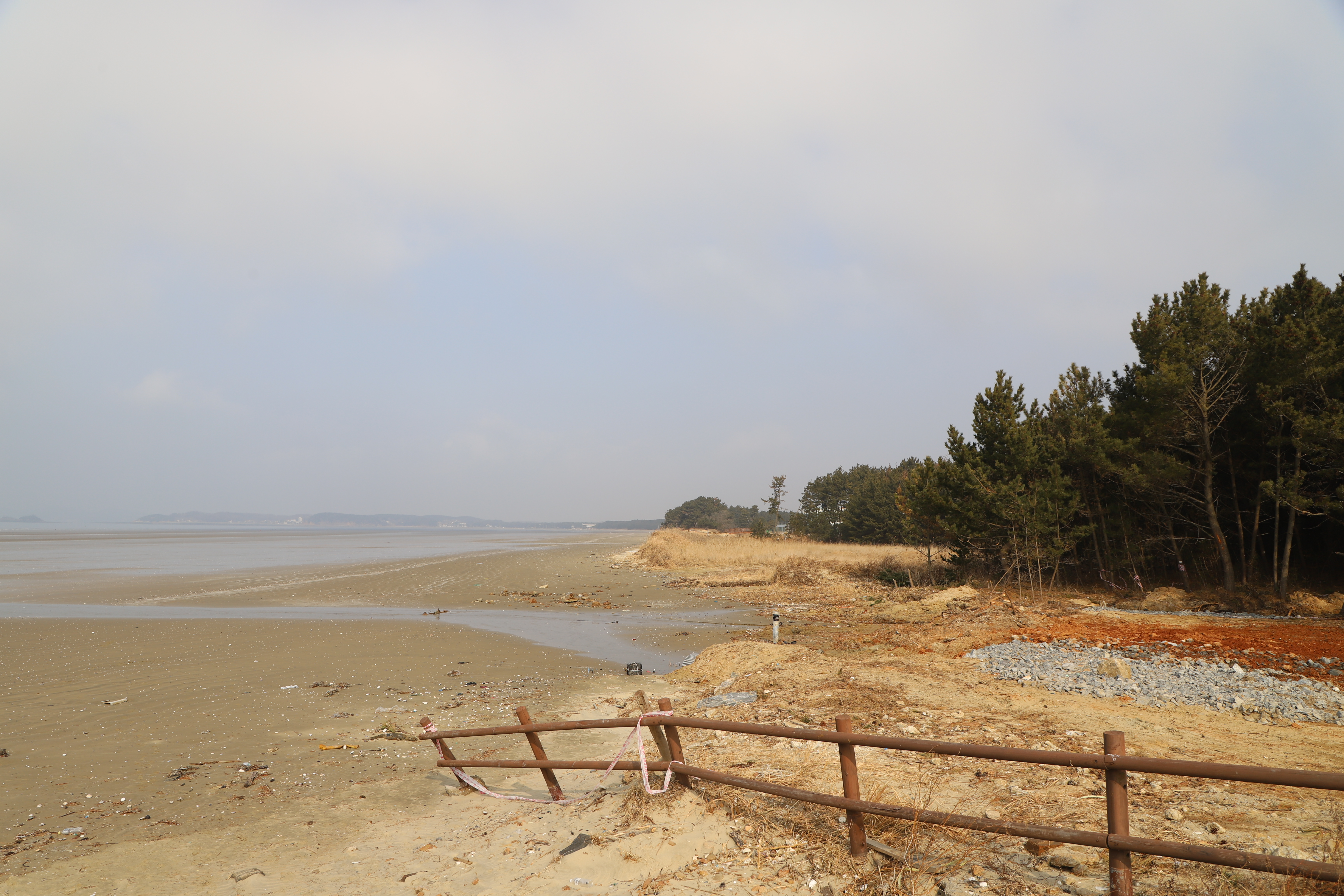 신장리 해안의 해송숲을 지난다. 해송숲에 달산리 이정목이 서 있다. 태안군 남면의 면 소재지인 달산리의 권력이 큰 것인지 신장리 지역은해안은 너무 좁다. 달산포 제방이 있는 곳까지를 신장리 지역에 포함시키는 것이 합당해 보인다. 달산포 제방 위쪽은 간척지 지역으로 고잿목(皐子項)들이라 불린다고 한다. 바닷물은 달산리와 신장리 지역까지 파고들었을 것이다. 달산포구에 제방을 쌓으면서 위쪽에 드넓은 들녘이 생겨나 달산리 지역은 풍요해 보인다. 그 동북쪽에 태안군 남면 행정중심지 남면사무소, 교육의 중심 남면초등학교와 중학교가 자리하는데, 달산포 제방에서 살피면 건물들이 솟은 모습이 보인다.