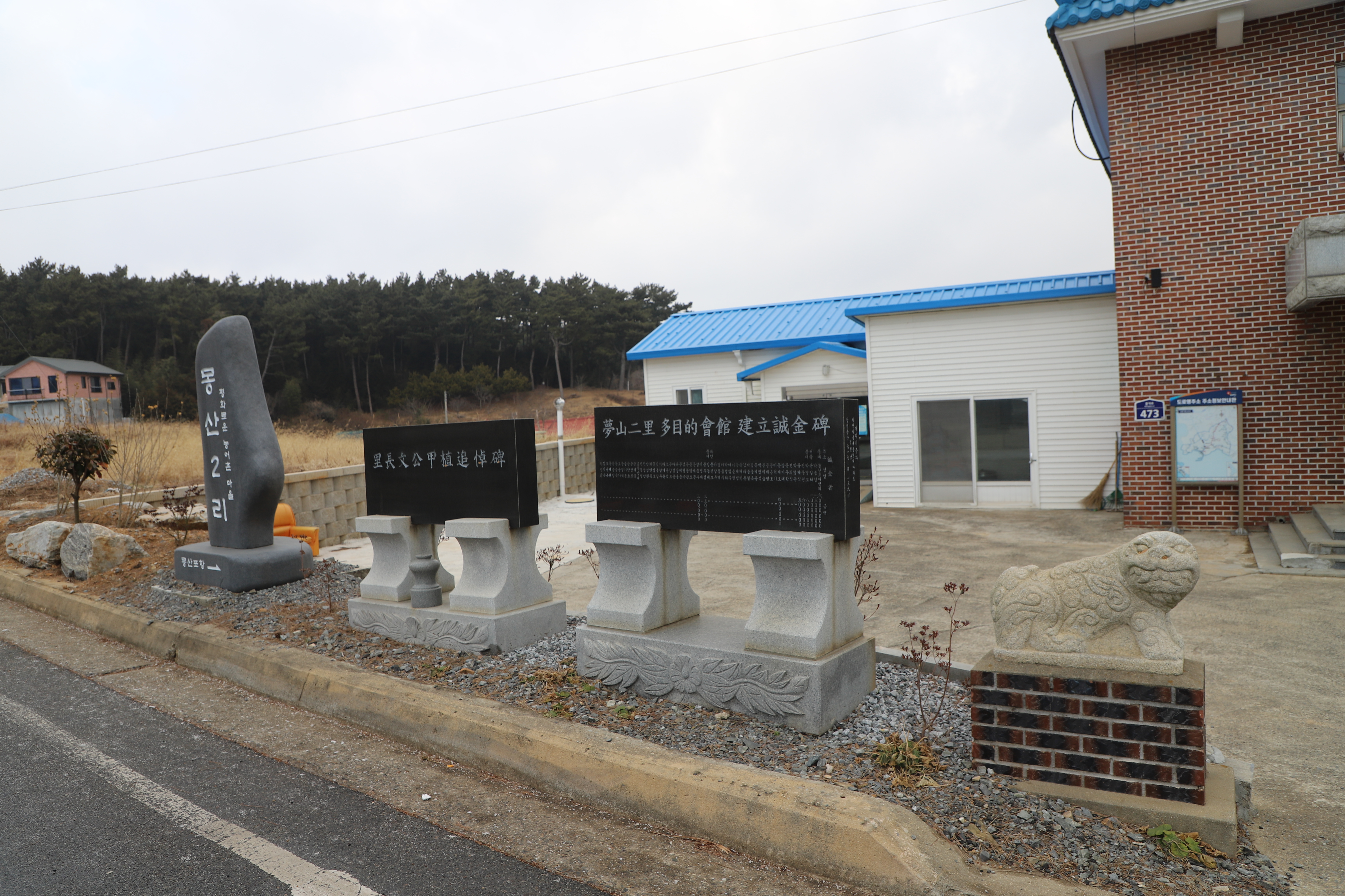 몽산2리 다목적회관 앞에 몽산2리 다목적회관 건립성금비와 이장 문갑식 추도비, 몽산2리 표석이 세워져 있다.