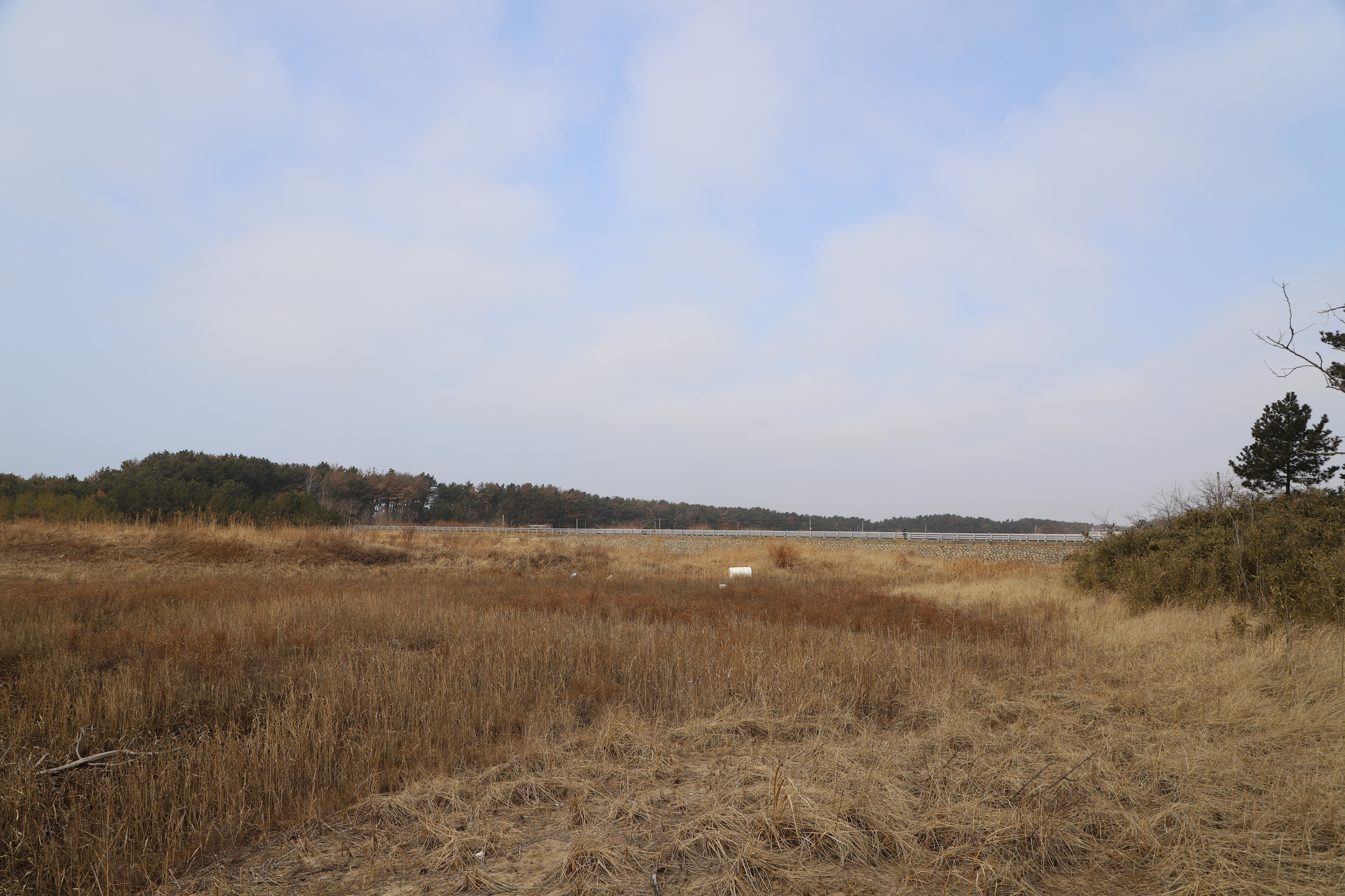 달산포 해변의 해송숲을 나오면 간척지인 고잿목들이 펼쳐지고, 오른쪽에 달산포 제방, 건너편에 펜션 두 곳이 있다.