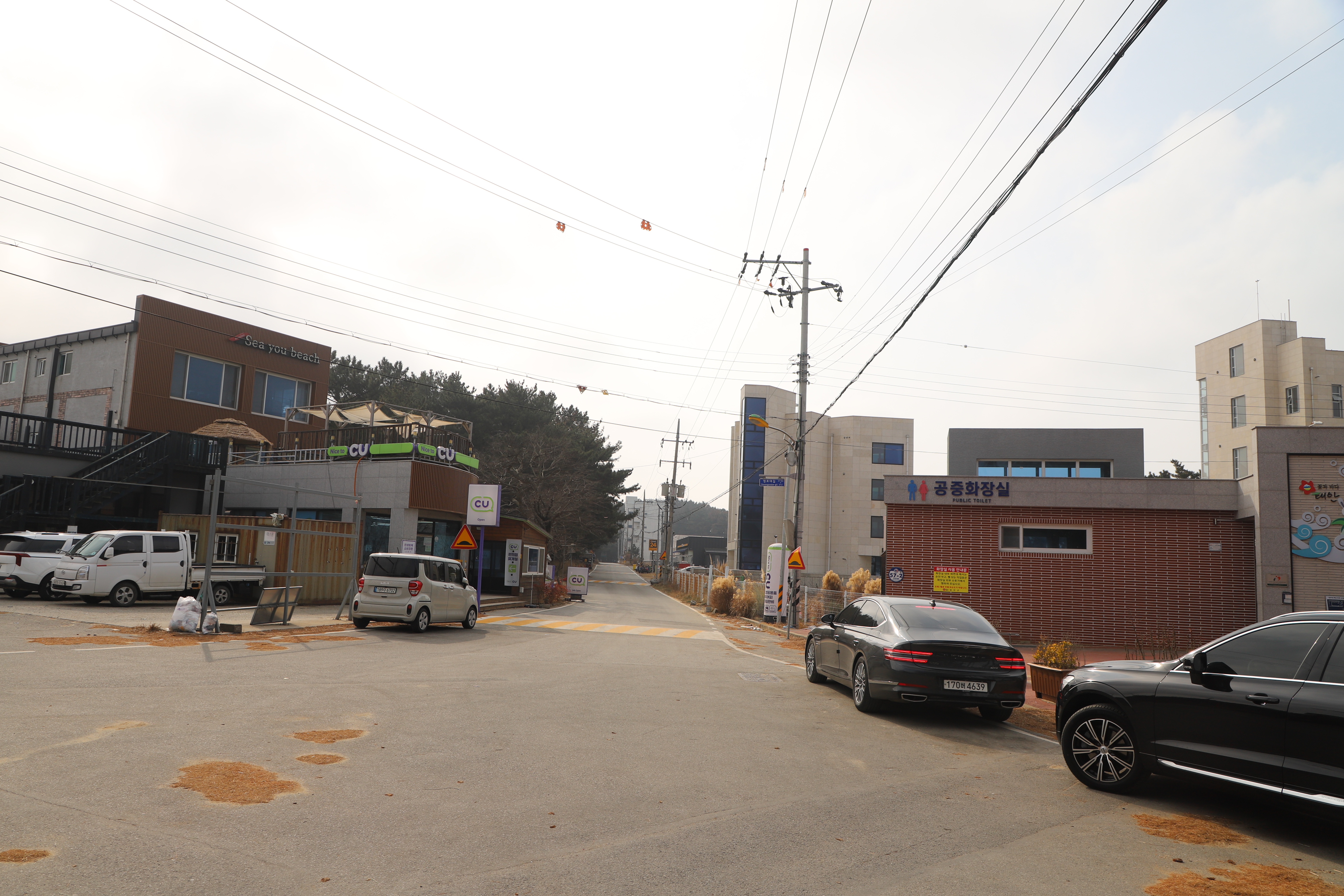 왼쪽에 씨유비치(Sea you beach) 펜션과 CU 편의점, 오른쪽에 공중화장실이 있다. 계속 청포대길을 따라간다.