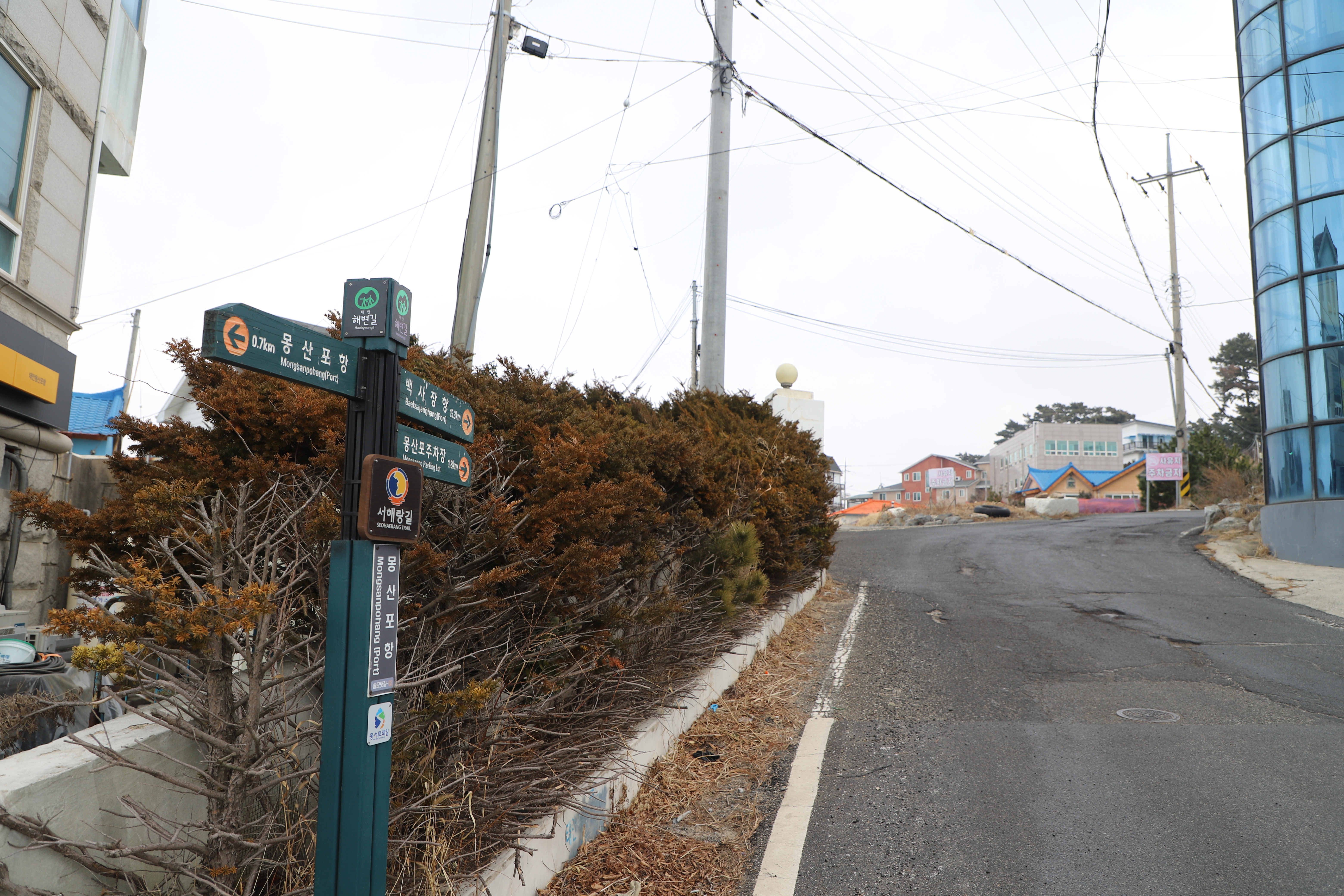 동서트레일 2·3구간 시종점에서 2구간을 역방향으로 출발하여 이마트 옆 언덕길로 올라간다. 오른쪽에 몽산포항 조형물이 있다.