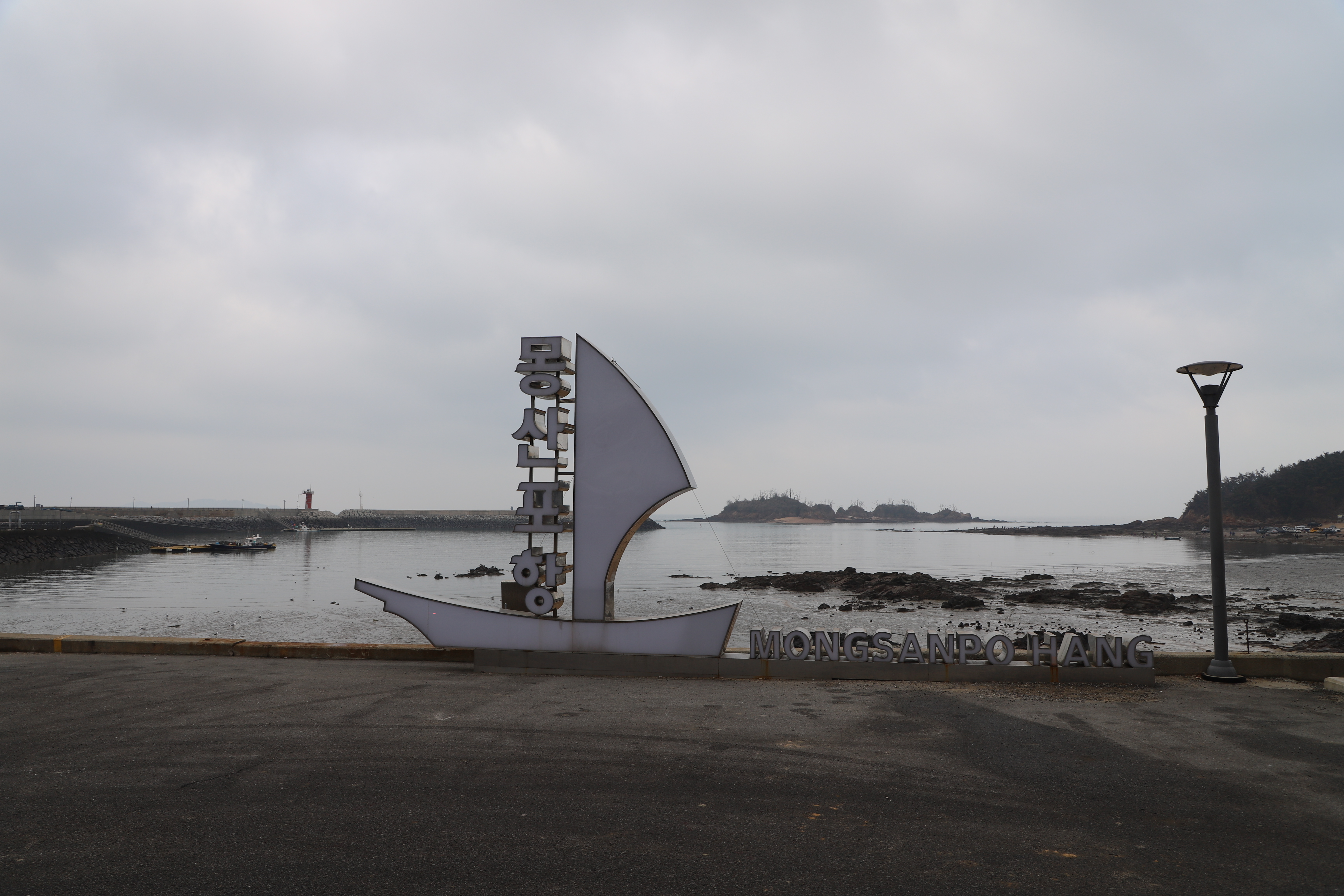 몽대포구 언덕에 몽산포항 조형물이 조성되어 있고, 그 오른쪽에 몽대포구 버스정류소가 있다. 바다에는 안목도가 떠 있다.