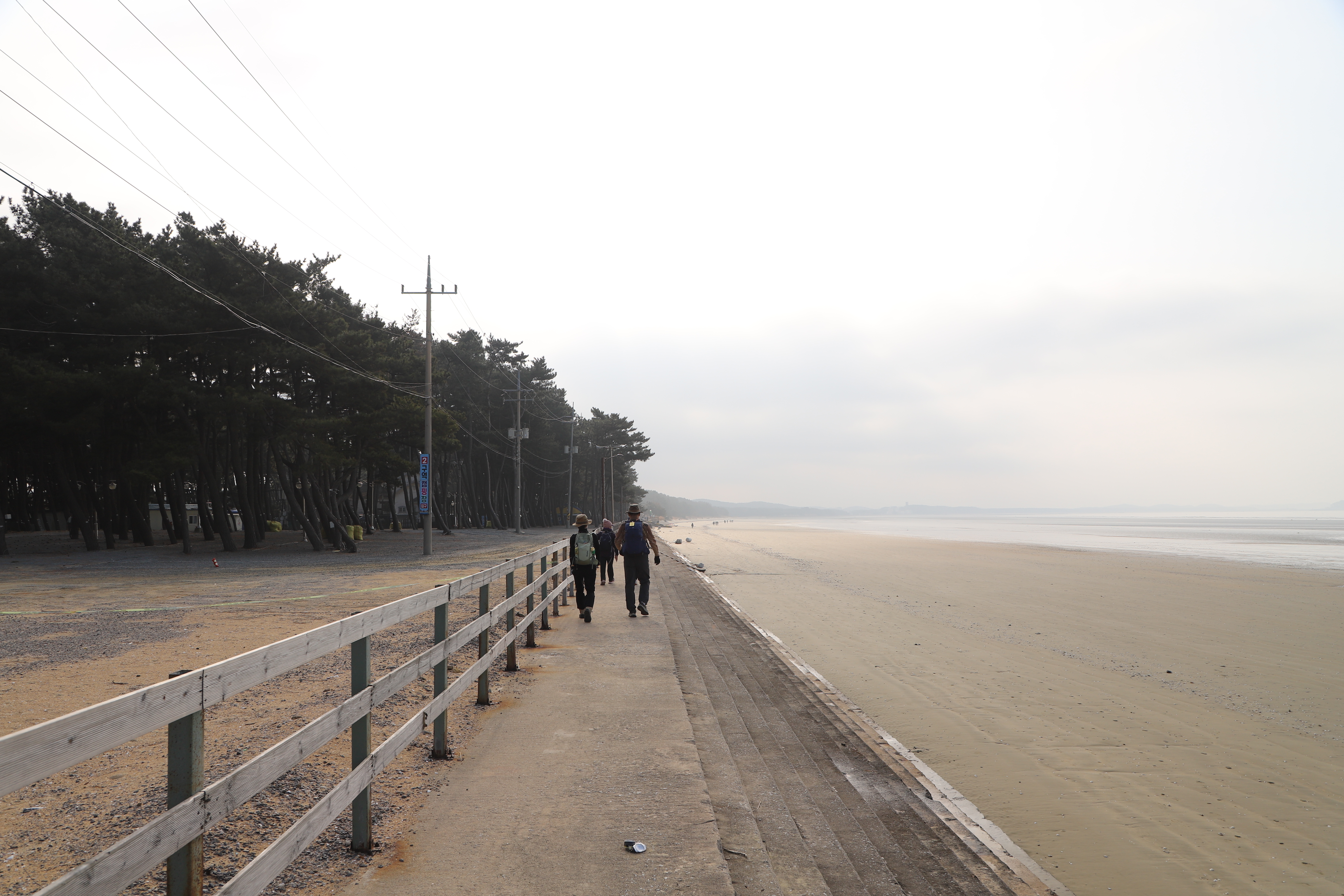 몽산포 해수욕장의 해변길을 따라간다. 오른쪽 맨 뒤에 마검포가 흐릿하게 보인다.
