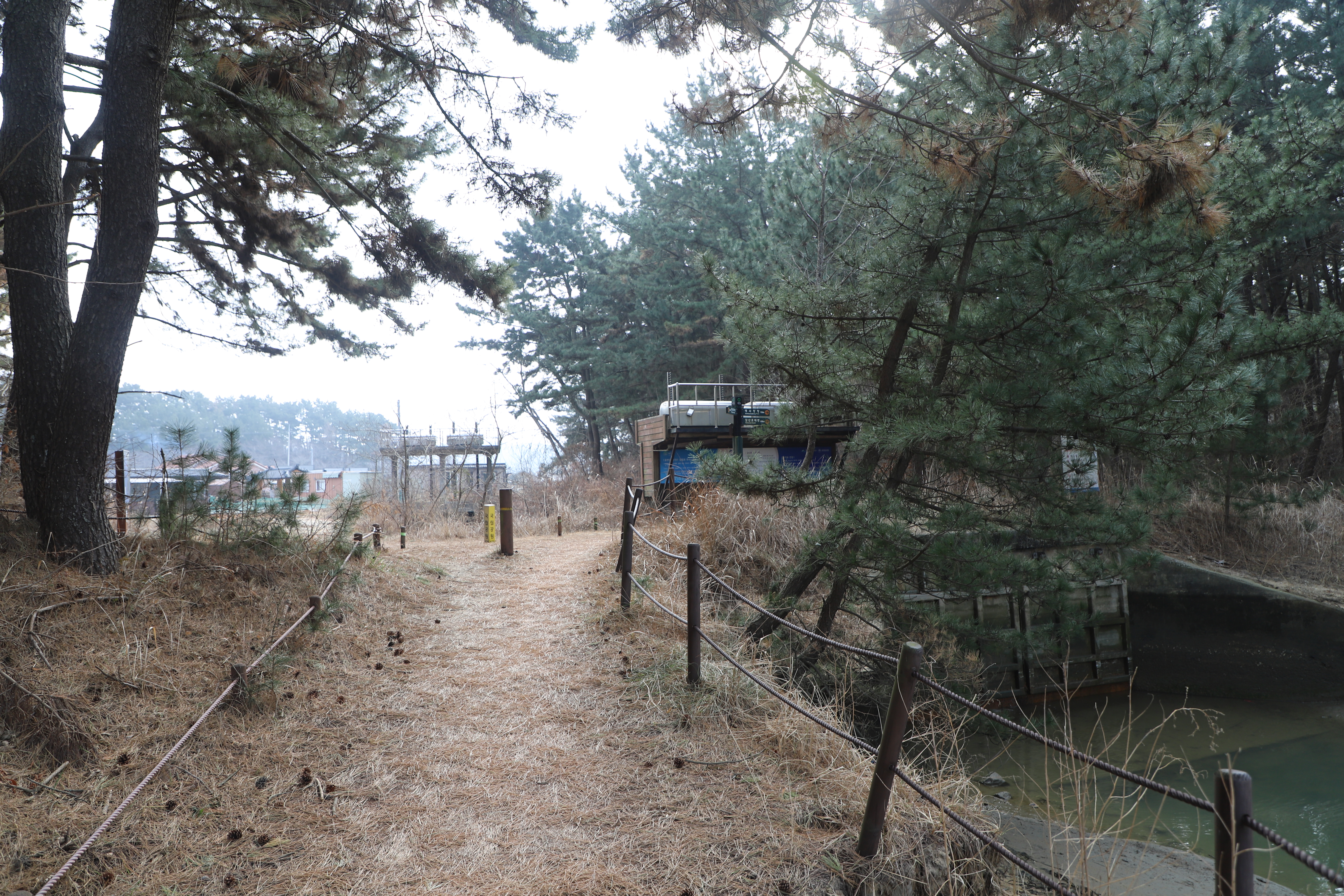 태안군 남면 몽산리에서 신장리로 넘어와 수문이 설치되어 있는 수로의 다리에서 걸어온 해송숲길을 뒤돌아보았다.