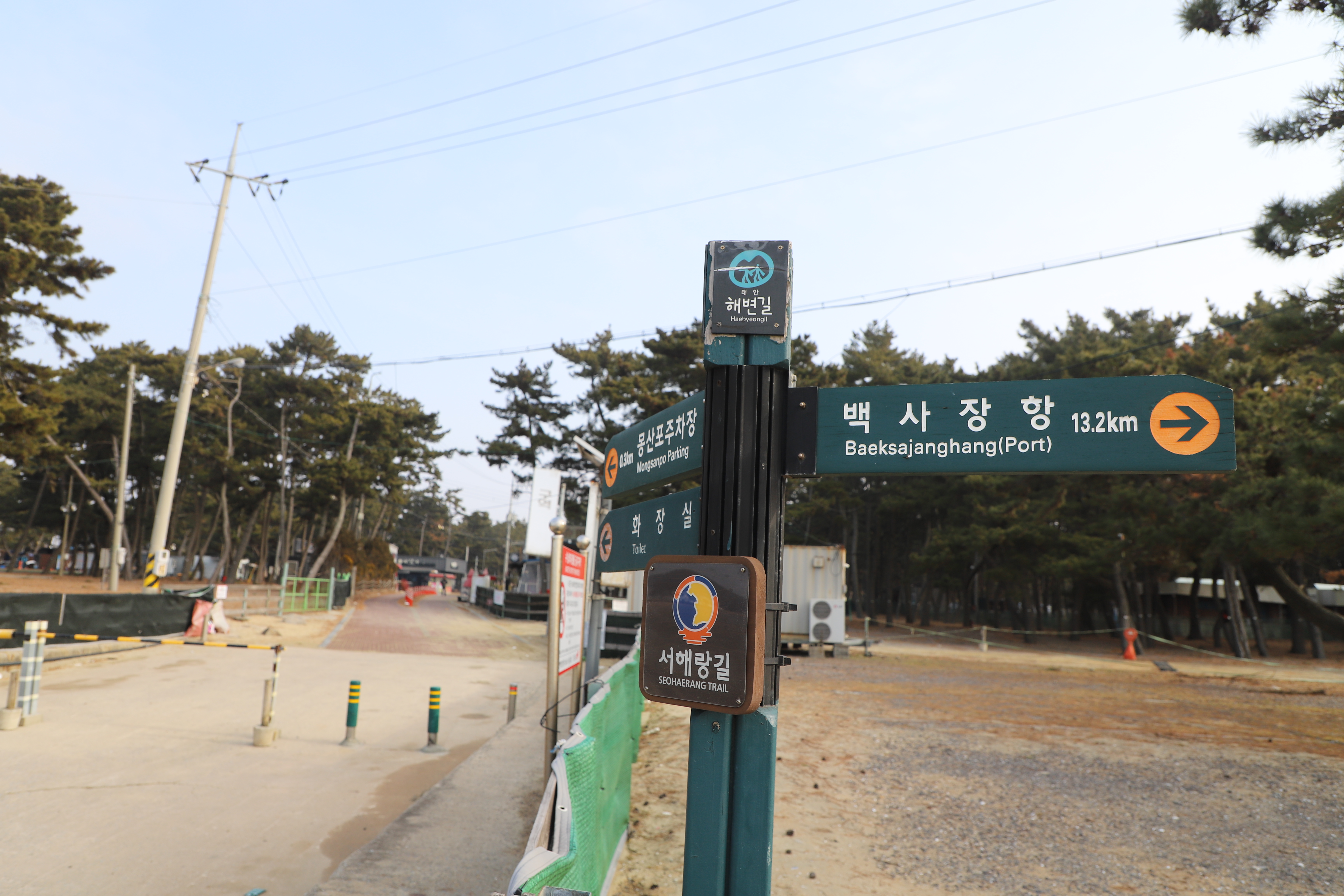 백사장항 15.3km 지점의 이마트 옆 몽대로 언덕에 몽산포항 이정목이 서 있다. 동서트레일은 태안해변길·서해랑길과 동행한다.