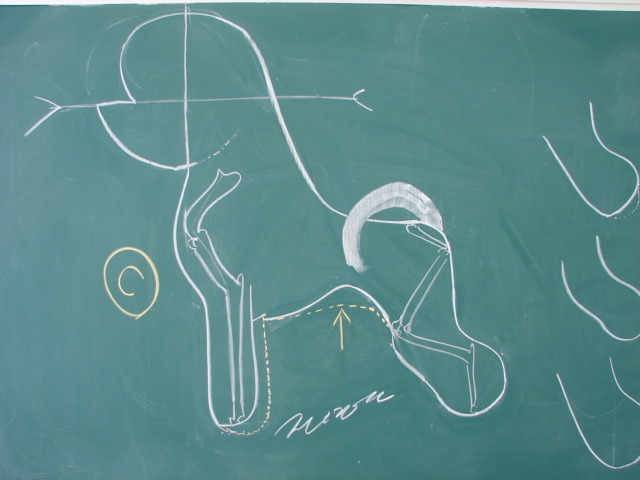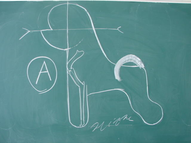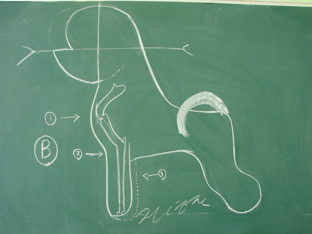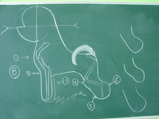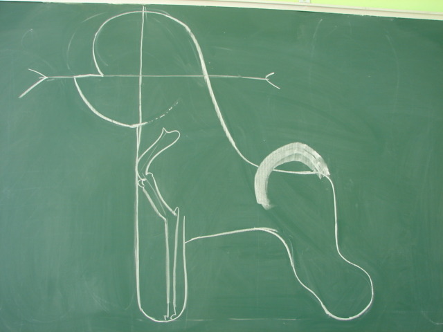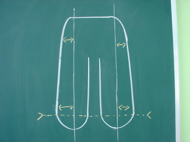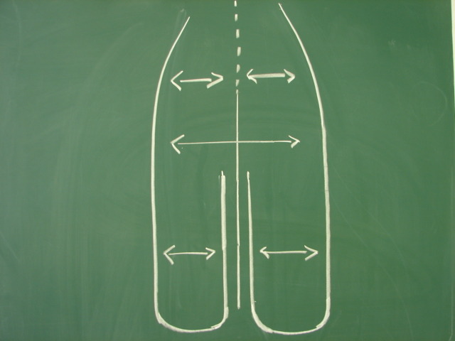 골반의 넓이 ,특히 옆부분을 자를때 중심선에서 약간 밖으로 자르면서 화살표를 중심으로 해서 다리의 중심과 발란스를 잡야야 하는것
