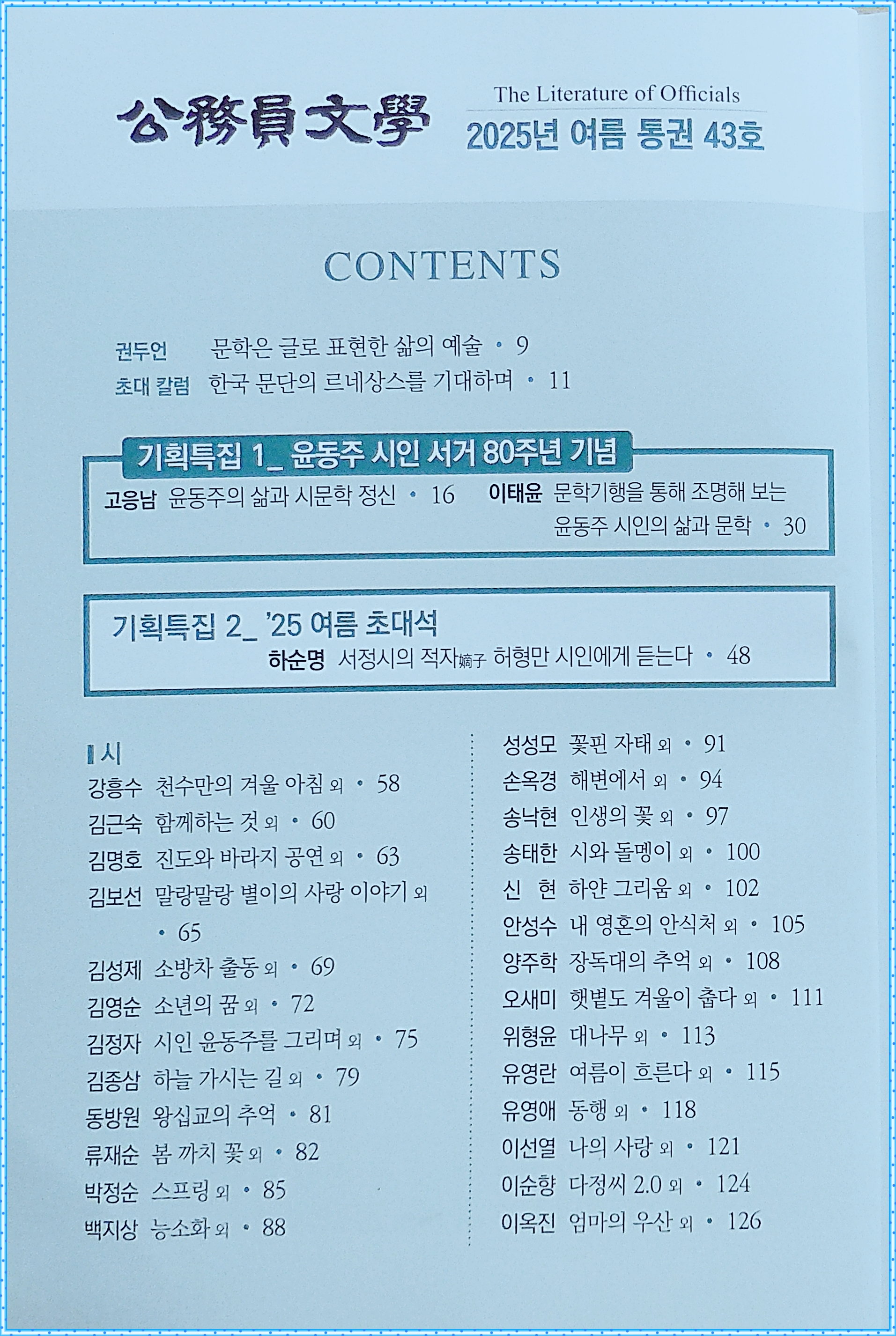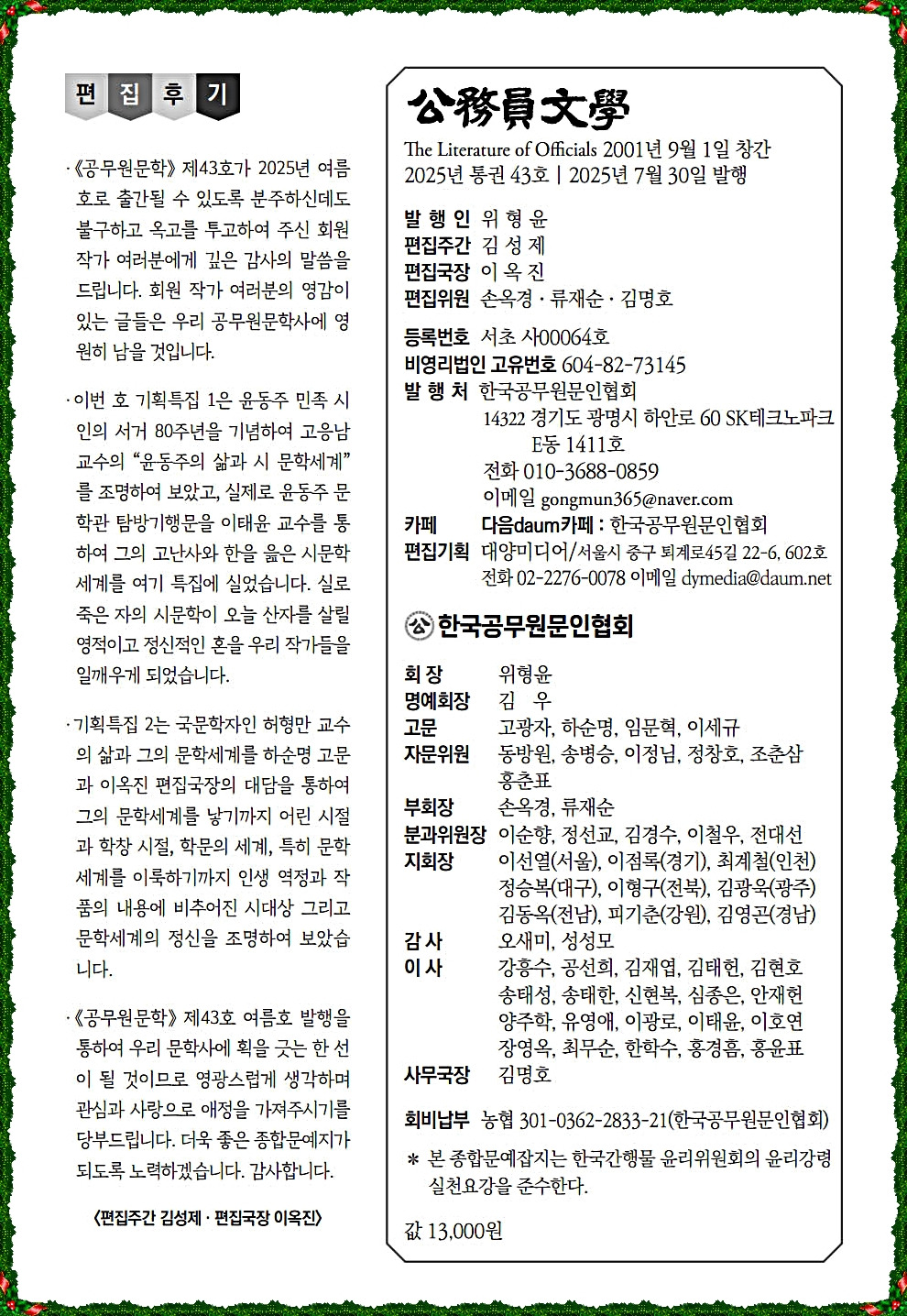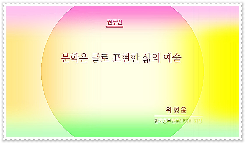 한국공무원문인협회(회장 위형윤).. "공무원문학 제43호" 출판 축하! 작성자조선희|작성시간25.08.04|조회수44 목록 댓글 2 글자크기 작게가 글자크기 크게가 한국공무원문인협회 "공무원문학 제43호" 출판 축하! 한국공무원문인협회(회장 위형윤).. "공무원문학 제43호" 출판 축하! 다음검색 현재 게시글 추가 기능 열기 북마크 공유하기 신고 센터로 신고 댓글 댓글 2 댓글쓰기 댓글 리스트 작성자조선희 작성자 본인 여부 작성자 | 작성시간 25.08.14 이미지 확대 작성자조선희 작성자 본인 여부 작성자 | 작성시간 25.08.14 이미지 확대 댓글 전체보기