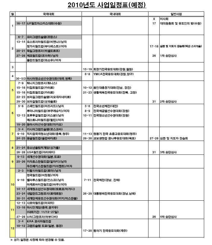 [스크랩] 2010년 사업 일정표 (각종 국제 국내 대회 및 승단과 행사 일정) 작성자유동우|작성시간10.02.11|조회수60 목록 댓글 0 글자크기 작게가 글자크기 크게가 2010 일정표.pdf 첨부파일첨부된 파일이 2개 있습니다. jpg 파일 d.jpg 다운로드 pdf 파일 2010 일정표.pdf 다운로드 다음검색 스크랩 원문 : 깨끗한 한판(유도) 현재 게시글 추가 기능 열기 북마크 공유하기 신고 센터로 신고 댓글 댓글 0 댓글쓰기 답글쓰기 댓글 리스트