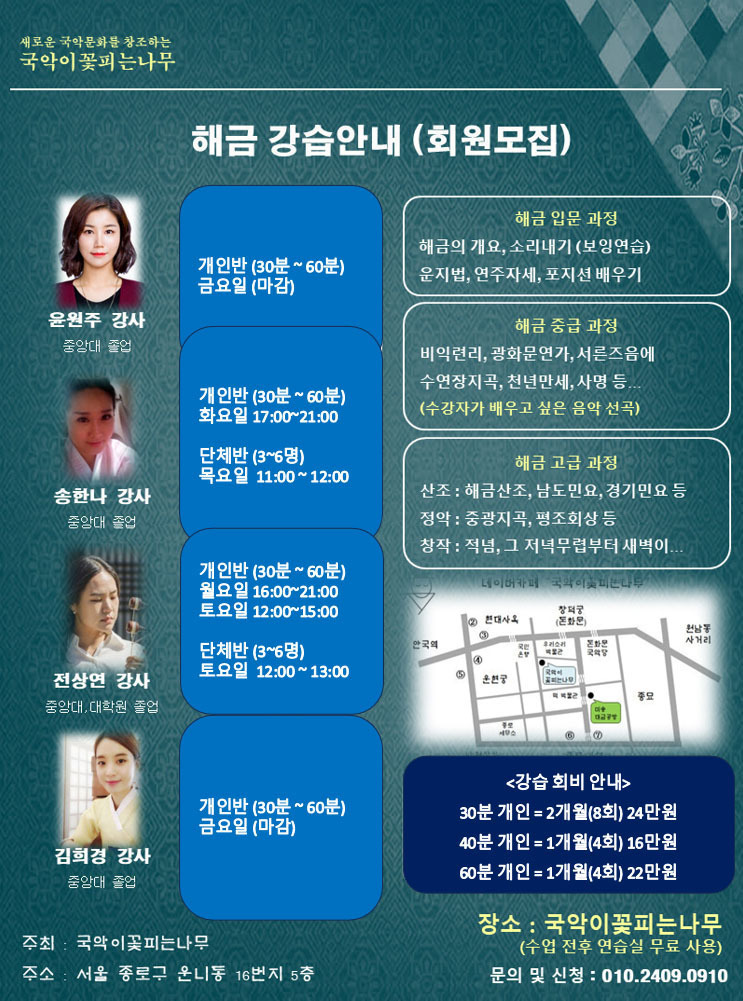 홍길동/010-8282-8599/해금/월요일/오후1시... 신청합니다.