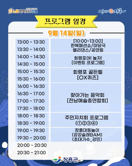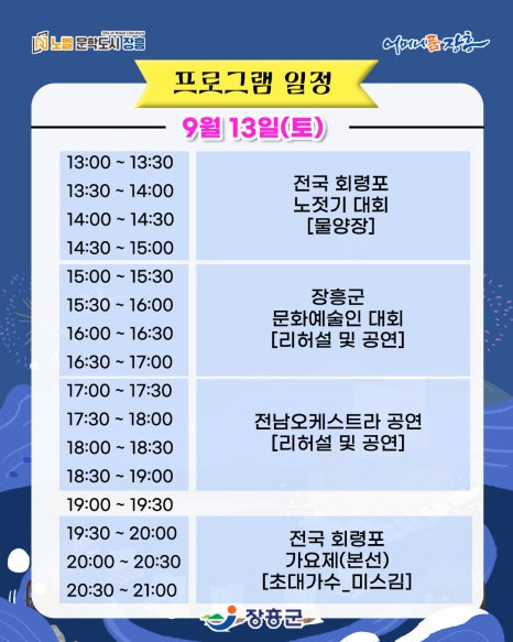 | Point 행 사 내 용 | ✔ 인문학 포럼 & 명량해전 승전 의의 ✔ 12척 해상퍼레이드 & 출정식 ✔ 만선기원 풍어제, 군악대 공연 ✔ 전국 회령포 노젓기 대회 ✔ 전남오케스트라, 문화예술인 공연 ✔ 전국 회령포 가요제 & 초대가수 무대 (박서진, 미스김, 강민 등) ✔ 화려한 개막축하공연 & 불꽃쇼 🎆 |