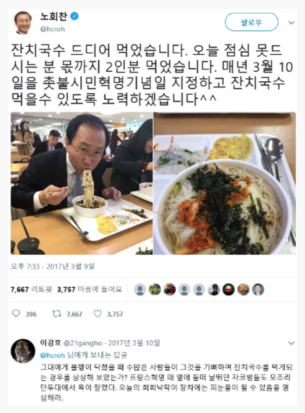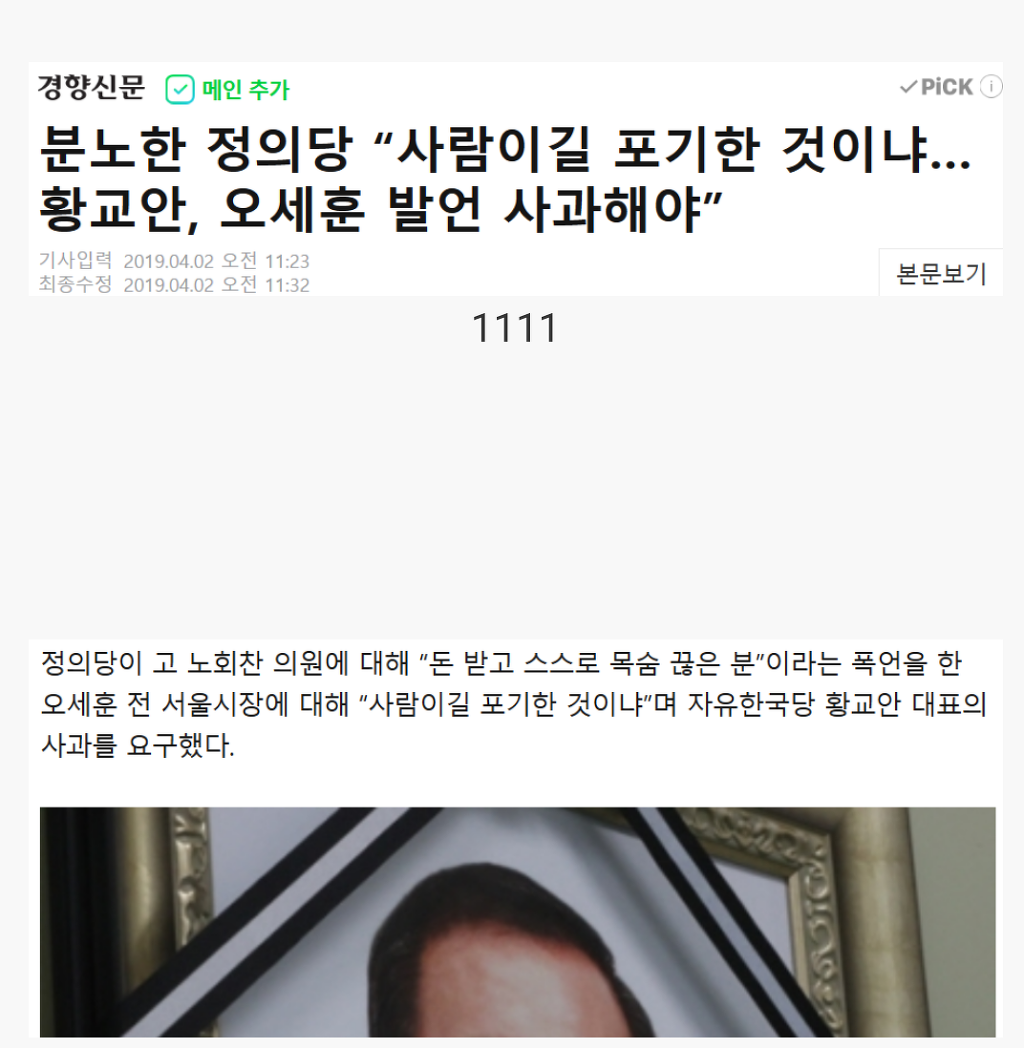 정의당이 와 이리 화를 내노? 작성자한길(인천)|작성시간19.04.03|조회수176 목록 댓글 1 글자크기 작게가 글자크기 크게가 창원 성산에서 싸움났다!2017년 3월 10일 잔치국수 먹은 놈은 천벌을 받은 것이다. 다음검색 현재 게시글 추가 기능 열기 북마크 공유하기 신고 센터로 신고 댓글 댓글 1 댓글쓰기 답글쓰기 댓글 리스트 작성자일송정 | 작성시간 19.04.03 정의당이 아니라 빨간 불의당입니다그놈들이나 자한당이나 색깔이 같음 댓글 전체보기