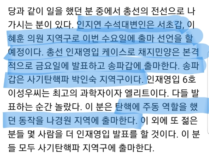당과 같이 일을 했던 분 중에서 총선의 전선으로 나가시는 분이 있다. 인지연 수석대변인은 서초갑, 이혜훈 의원 지역구로 이번 수요일에 출마 선언을 할 예정이다. 총선 인재영입 케이스로 채지민양은 본격적으로 금요일에 발표하고 송파갑에 출마한다. 송파갑은 사기탄핵파 박인숙 지역구이다. 인재영입 6호 이성우씨는 최고의 과학자이자 엘리트이다. 다들 발표하는 순간 놀랐다. 이 분은 탄핵에 주동 역할을 했던 동작을 나경원 지역에 출마한다. 이 외에 또 젊은 분들 몇 사람을 더 인재영입 발표를 할 것이다. 이 분들 모두 사기탄핵파 지역구에 출마한다.