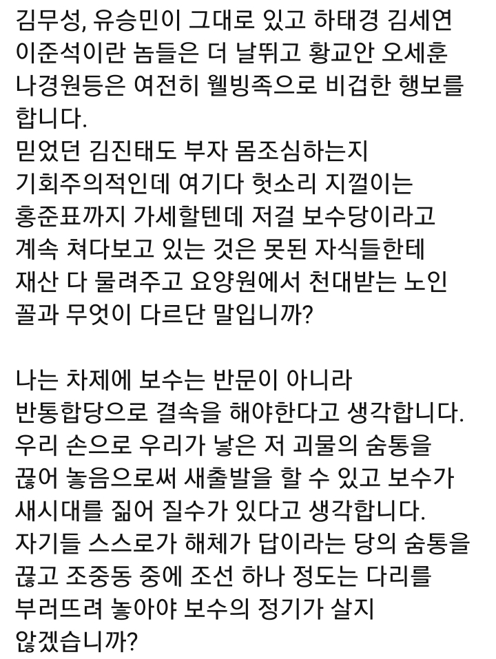그런데도 눈뜨고 보고만 있으면서 해달라는 대로 다해주는 그런 정치하는 인간들이 위장보수가 아니고 무었인가?