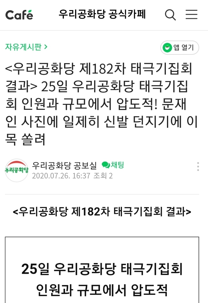 작성자레이나작성시간20.07.26조회수180 목록 댓글 225일 우리공화당이 주관하고 천만인무죄석방본부가 주최하는 태극기집회, 제182차 태극기집회가 5만여 명의 뜨거운 참여 속에 열렸다. 오후 1시부터 광교사거리에서 시작된 우리공화당 태극기집회는 각종 대형 애드벌룬과 수많은 태극기, 성조기, 당기들의 물결로 장관을 이루었다.