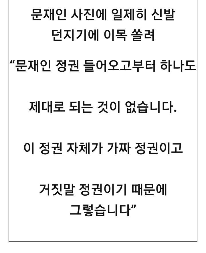 1부 집회의 연사로 나온 30대 청년인 이성우 최고위원의 “문재인 정권에 저항하는 우리공화당이 옳았습니다”라는 뜨거운 연설 후, 퍼포먼스가 시작되어 신발 맞아도 싼 ‘문재인’ 사진 형상이 무대로 올라왔고 몇몇 동지들이 문재인 얼굴을 향해 신발을 던져 맞게 했다. 이후 일제히 모두가 신발을 하늘을 향해 던지며 문재인 좌파독재정권에 대한 저항의지와 분노를 표출시켰다. 신발 퍼포먼스 후에는 연사인 인지연 최고위원이 “문재인 좌파독재정권은 법치 무시, 자유민주주의 해체시키는 깡패정권, 도적놈들 정권입니다”라고 규정했다.