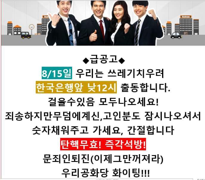 8.15일 12시, 우리는 쓰레기 치우러 한국은행앞으로 출동합니다!! 작성자엔젤라|작성시간20.08.12|조회수330 목록 댓글 0 글자크기 작게가 글자크기 크게가 가자!! 한국은행앞으로... 다음검색 현재 게시글 추가 기능 열기 북마크 공유하기 신고 센터로 신고 댓글 댓글 0 댓글쓰기 답글쓰기 댓글 리스트