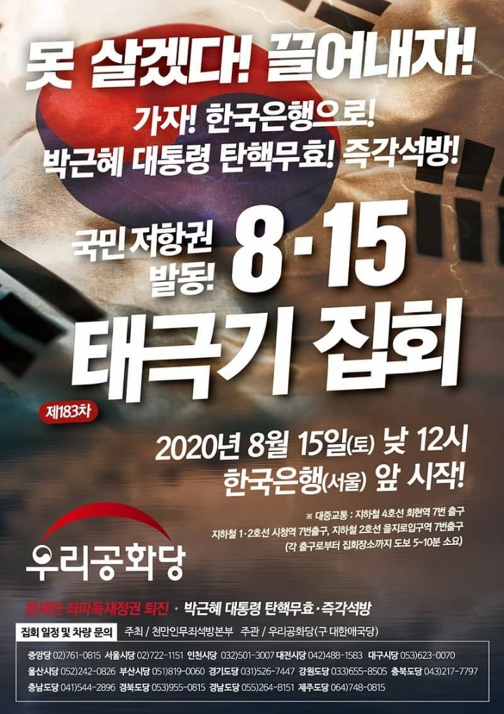 우리공화당은 8월 15일(토) 건국 72주년 광복 75주년 건국일, 광복절에 낮 12시 서울 중구 한국은행 앞에서 문재인 좌파독재정권 때문에 못살겠다고 문재인을 끌어내자는 국민들과 함께 문재인 퇴진, 박근혜 대통령 즉각석방 탄핵무효 국민 총 저항의 태극기집회를 개최한다.