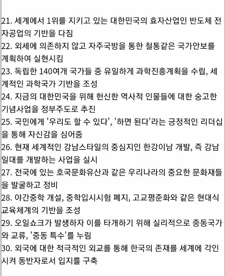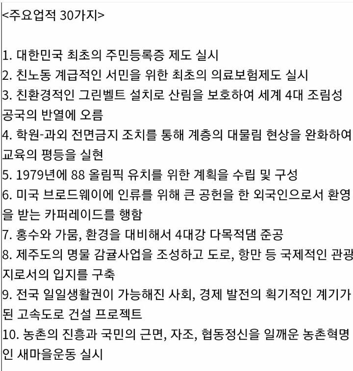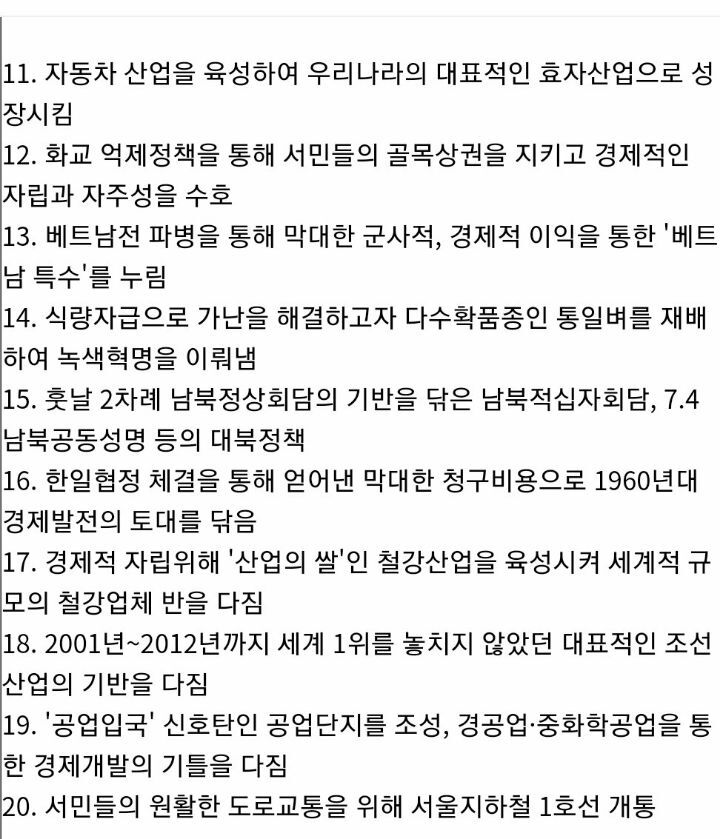 [박정희]박정희 대통령 주요업적 30가지. 작성자지킴이|작성시간21.09.13|조회수2,203 목록 댓글 0 글자크기 작게가 글자크기 크게가 다음검색 현재 게시글 추가 기능 열기 북마크 공유하기 신고 센터로 신고 댓글 댓글 0 댓글쓰기 답글쓰기 댓글 리스트