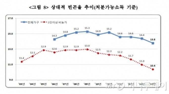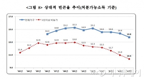 지난해 전체가구의 상대적 빈곤율은 조사이후 처음으로 14%를 밑돈 13.8%를 기록했다. 2014년 14.4%보다 0.6%p 감소한 것이다. 전체가구 기준 상대적 빈곤율도 처음으로 11%를 하회한 10.4%를 기록했다.