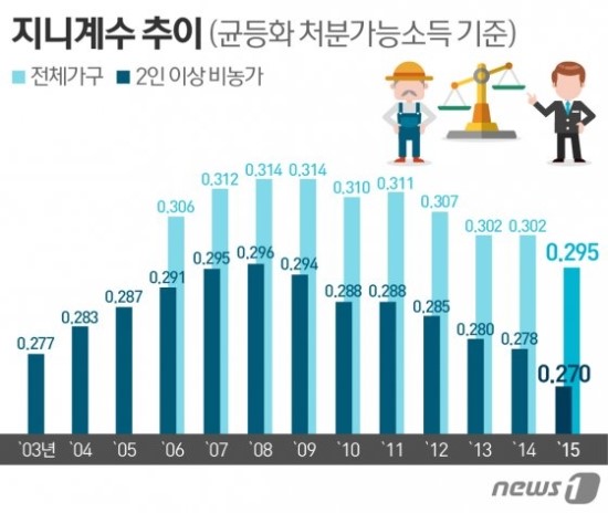 27일 통계청이 발표한 2015년 전체 및 전국가구 소득분배 결과에 따르면, 지난해 전체가구(1인 및 농가포함) 지니계수는 0.295로 2014년 0.302보다 0.007 감소했다. 또 2인이상 비농가를 기준으로 한 전국가구 기준 지니계수도 0.270으로 2014년 0.278보다 0.008 감소했다.