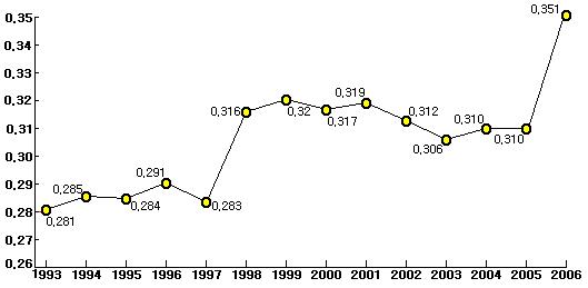 그렇게 혐오하는 독재정권시절이 지니계수가 가장 낮았고, 즉 소득분배가 가장 잘 이루어졌고 김영삼정권 말부터 급격히 올라가 노무현정권시절에 가장 극악한 상태입니다.