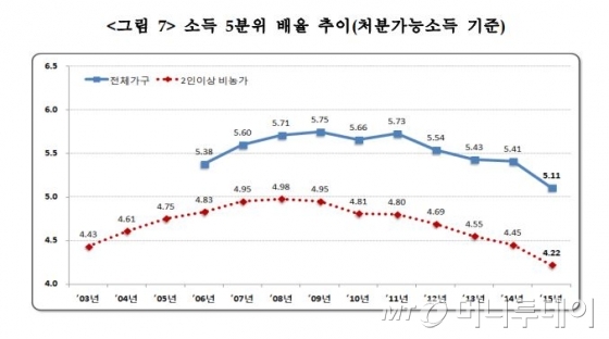 전체가구의 소득 5분위 배율도 5.11배로 2014년 5.41배에 비해 0.3배 포인트(p) 감소했다. 전국가구 기준 소득5분위 배율도 4.22배로 2014년 4.45배에 비해 0.23배p감소했다.