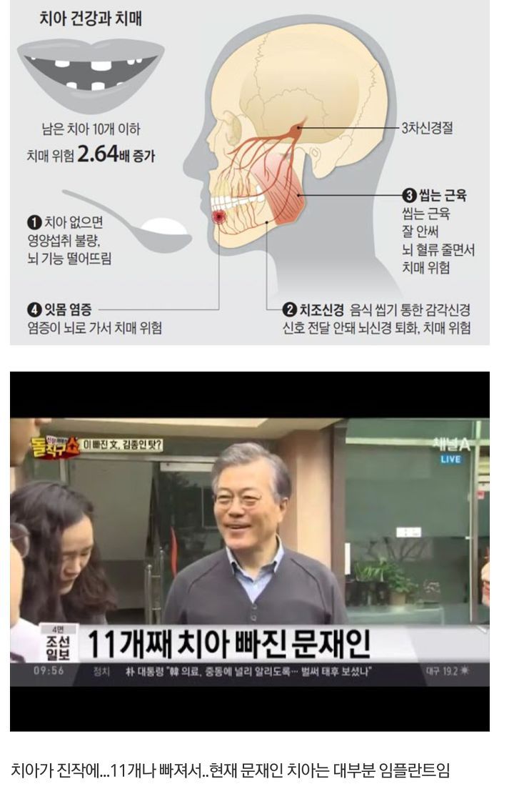 문제는 대선 당선 후에 본격적으로 드러나기 시작한다. 대통령 업무를 수행한지 얼마 안되 치아가 11개나 빠지는 일이 발생한다. 이를두고 많은 의혹이 제기됐다. 이유는 치아건강과 치매가 밀접한 관련이 있기 때문이다.(아래 사진)