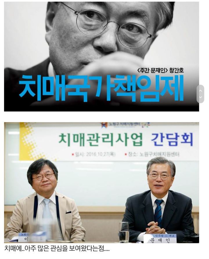 그리고 결정적인건 문 대통령이 치매에 대해서 남다른 관심을 보이고 있다는 점이다. 2016.10.27 치매관리사업 간담회에 참석하는 한편 '주간 문재인 창간호'에는 치매국가책임제를 전면에 걸고 발행하기도 했다.