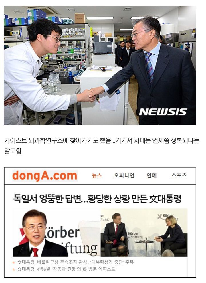 또 문재인 대통령은 카이스트 뇌과학 연구소에 방문해 치매는 언제 정복되냐고 물으며 남다른 관심을 보였다. 그리고 현재 문 정부는 치매예방부터 돌봄, 치료, 지원사업까지 치매 전주기에 대한 체계적인 지원에 나서고 있다.