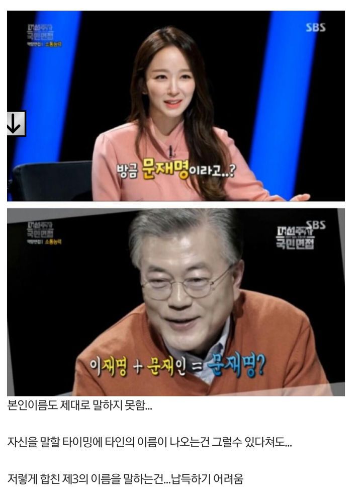 2017 더불어민주당 대선 후보 경선 당시, 문재인 대통령은 SBS 대선 기획 프로그램 '대선주자 국민면접'에서 이재명 후보의 이름과 본인의 이름을 헛갈린 듯 문재명이라고 부르는 사태가 벌어진다. 물론 이정도까지는 긴장한 나머지 그럴 수도 있다고 여겨진다. 그런데 또 다른 곳에선 사다리타기를 하는데 수차례 알려줘도 이해를 못하고 엉뚱하게 했다. 물론 이것도 이해를 하려면 할 수 있다.