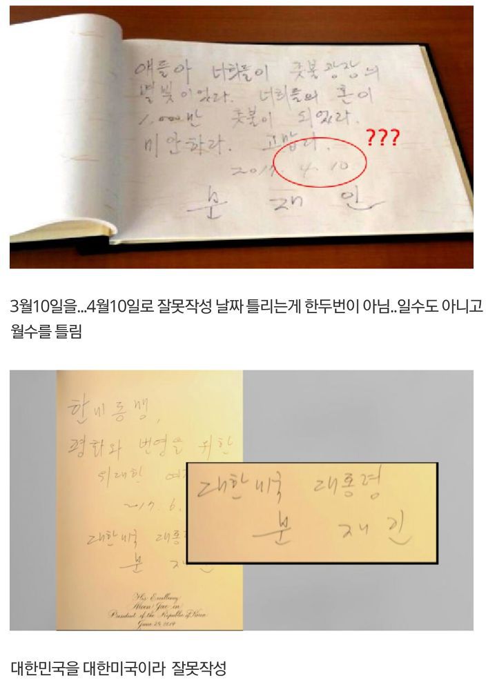 그런데 이뿐만이 아니다. 시간을 더 거슬러 올라가 2017년 3월 10일, 세월호 희생자들에게 남긴 방명록 중 일명 '얘들아 고맙다'를 작성할 때 날짜를 4월 10일로 남기는 실수를 하기도 한다.