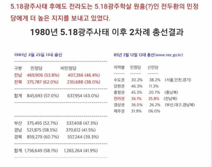 12대 총선은 1985년 2월 12일에 실시되었습니다. 5.18은 1980년 5월 18일이죠? 그럼 5.18 이후 시기의 총선에서 '민주정의당'이 호남 지역에서 높은 지지를 받았다는 건 팩트입니다.