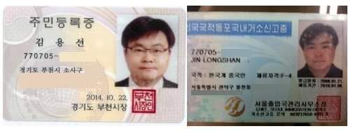 (첨부: 조선족 주민등록증 한글 표기는 한 글자씩 띄어쓰기로 표기하는 것을 보여주는 외국인 주민등록증 이미지)