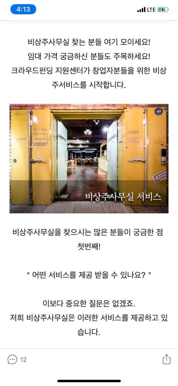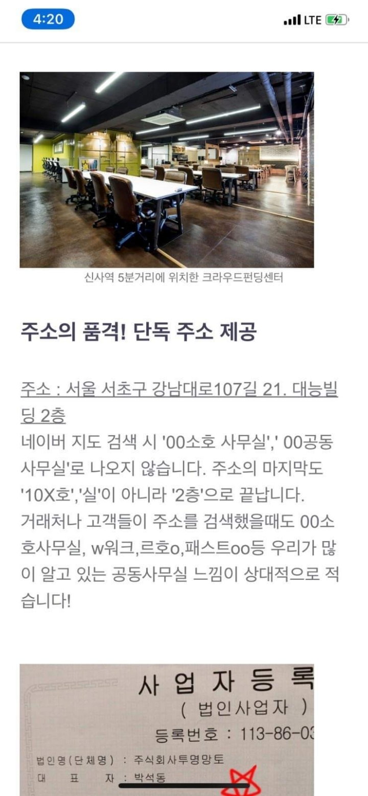 강남에 2층 전체를 주소지로 사용할 수 있어 회사가 있어보이게 하는 곳이라고 함