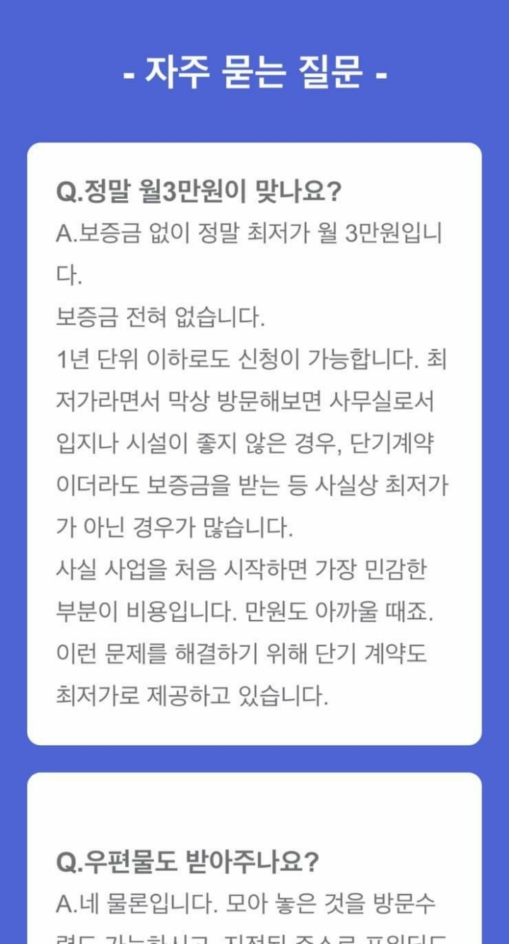 한마디로 한 달에 3만원만 내면 사무실은 없어도 사무실이 있는것처럼 전화도 받아주고 우편물도 받아주는 유령사무실 서비스를 한다는 말임