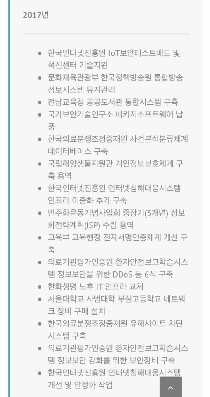 전남교육청, 민주화운동기념사업회 등 저짝 수주와 문화관광부, 인터넷진흥원, 교육부 등 관공서 수주가 주력임