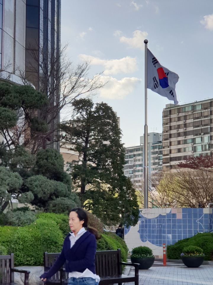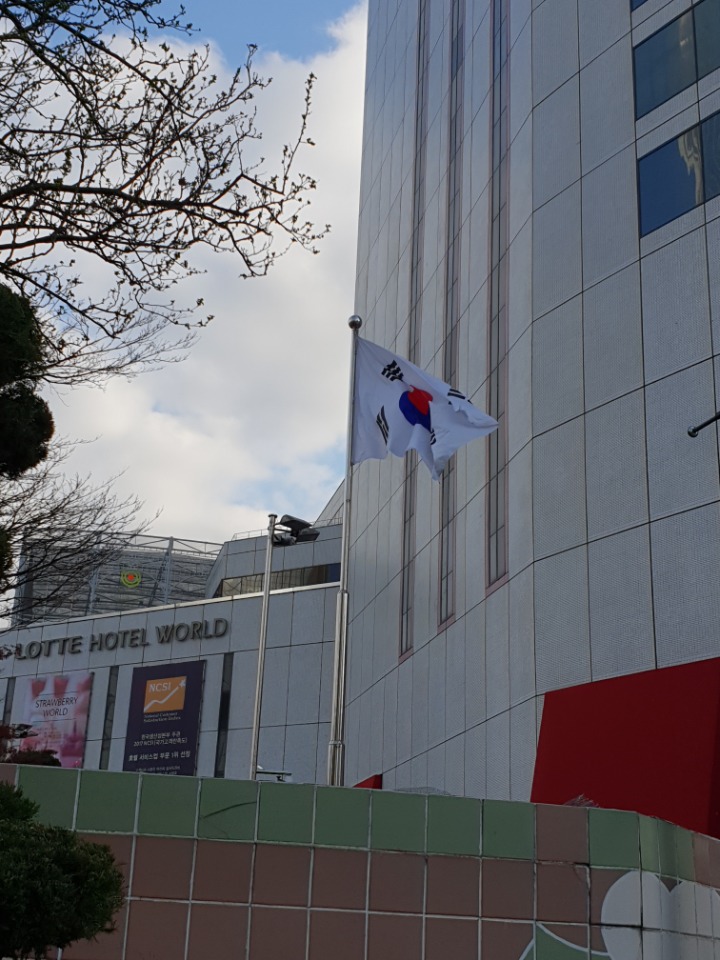 롯데백화점 정문앞에 태극기가 바람에 펄럭입니다