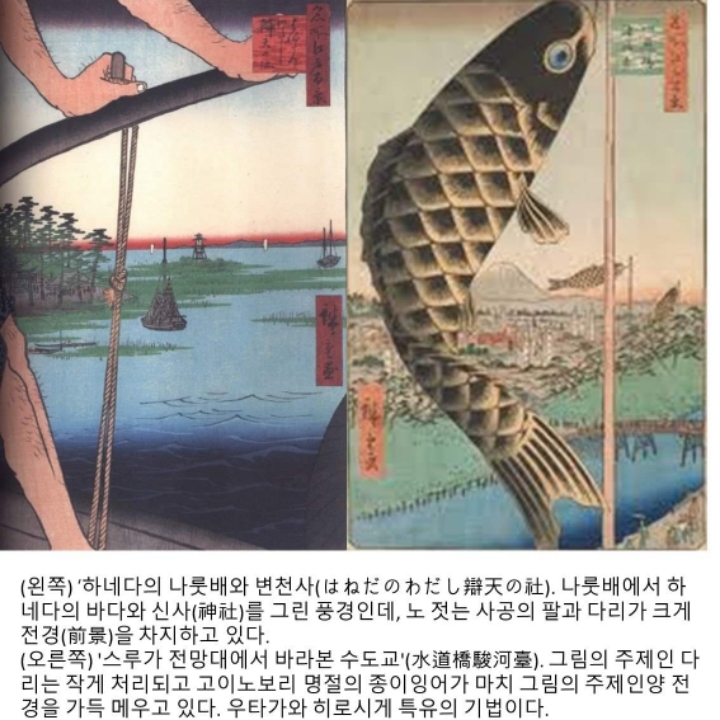 특히 우리의 관심을 끄는 것은 눈앞의 사물을 크게 그리고 핵심 주제를 작게 그리는 히로시게의 다이내믹한 구도가 마네에게 끼친 영향이다.